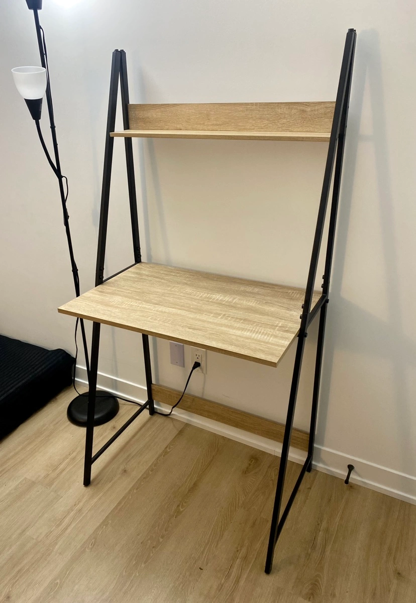 Desk with a shelf. Black metal frame and wood top and shelf. Just as new. Very lightly used.