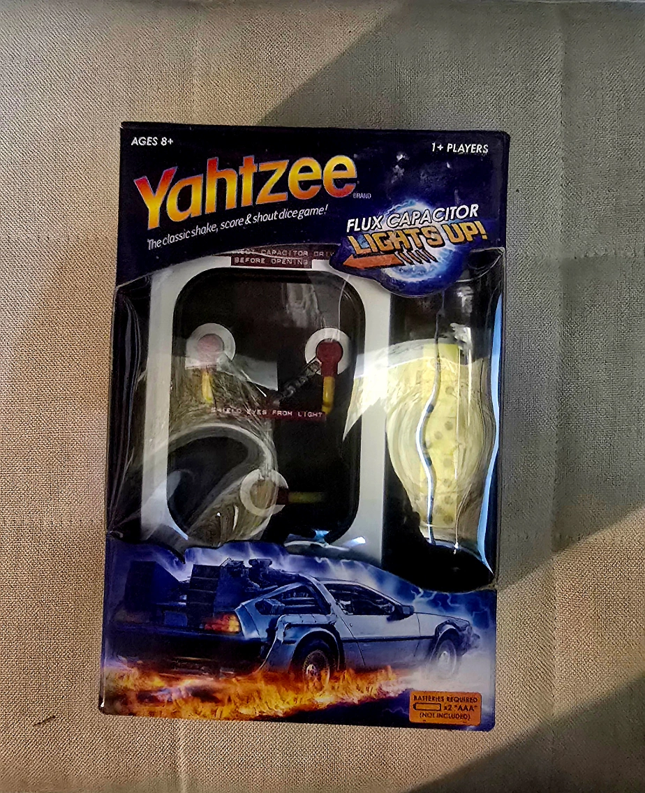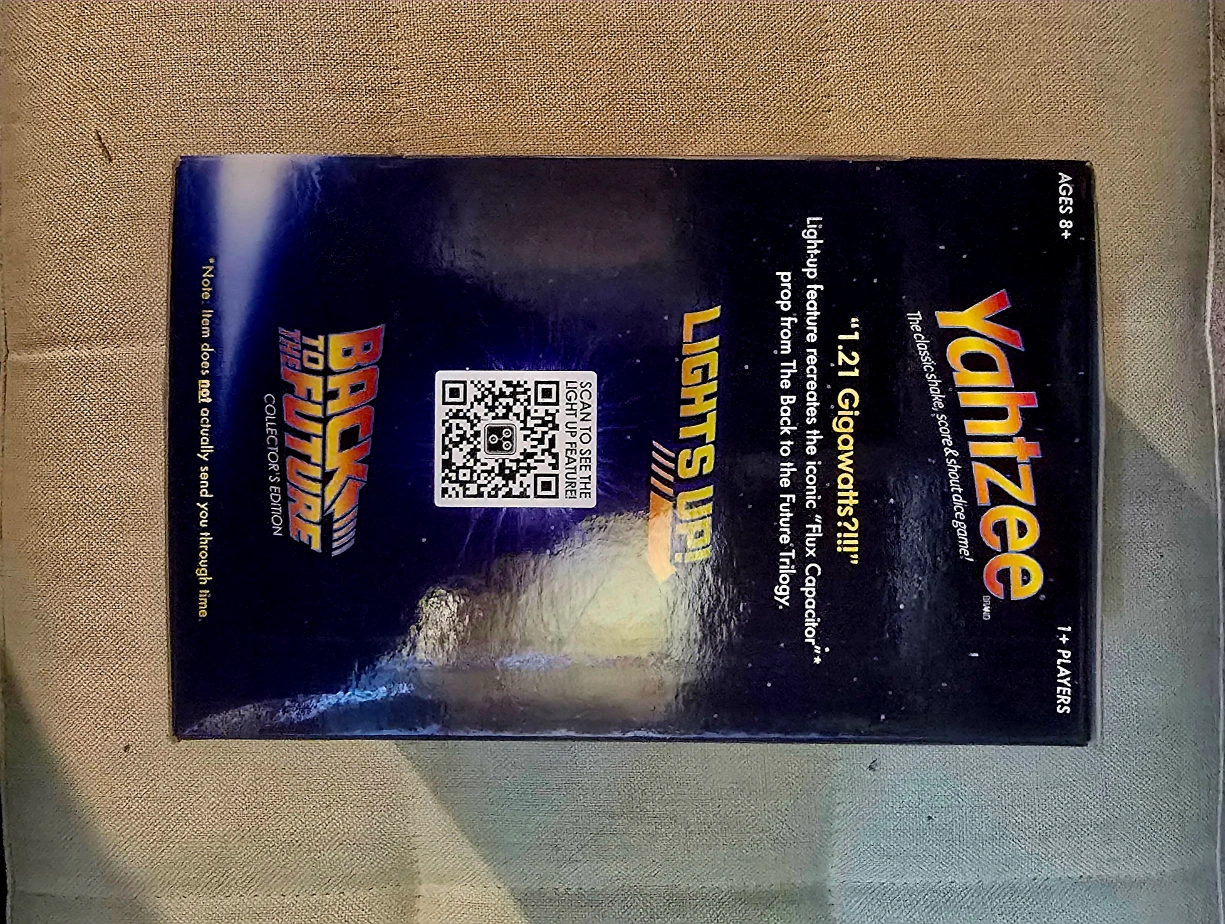 Get ready to travel through time with Marty and Doc in this Back to the Future themed Yahtzee game! It features a light-up Flux Capacitor. Great for ages 8 and up!