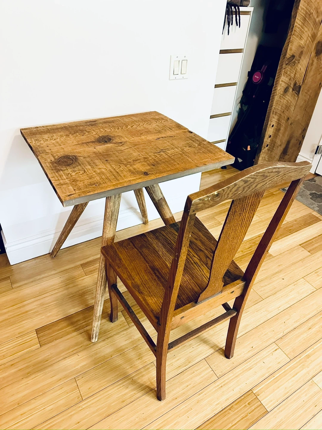 A cute little bistro table / desk made from authentic reclaimed barn board. Solid oak antique chair. Ideal size for smaller spaces.