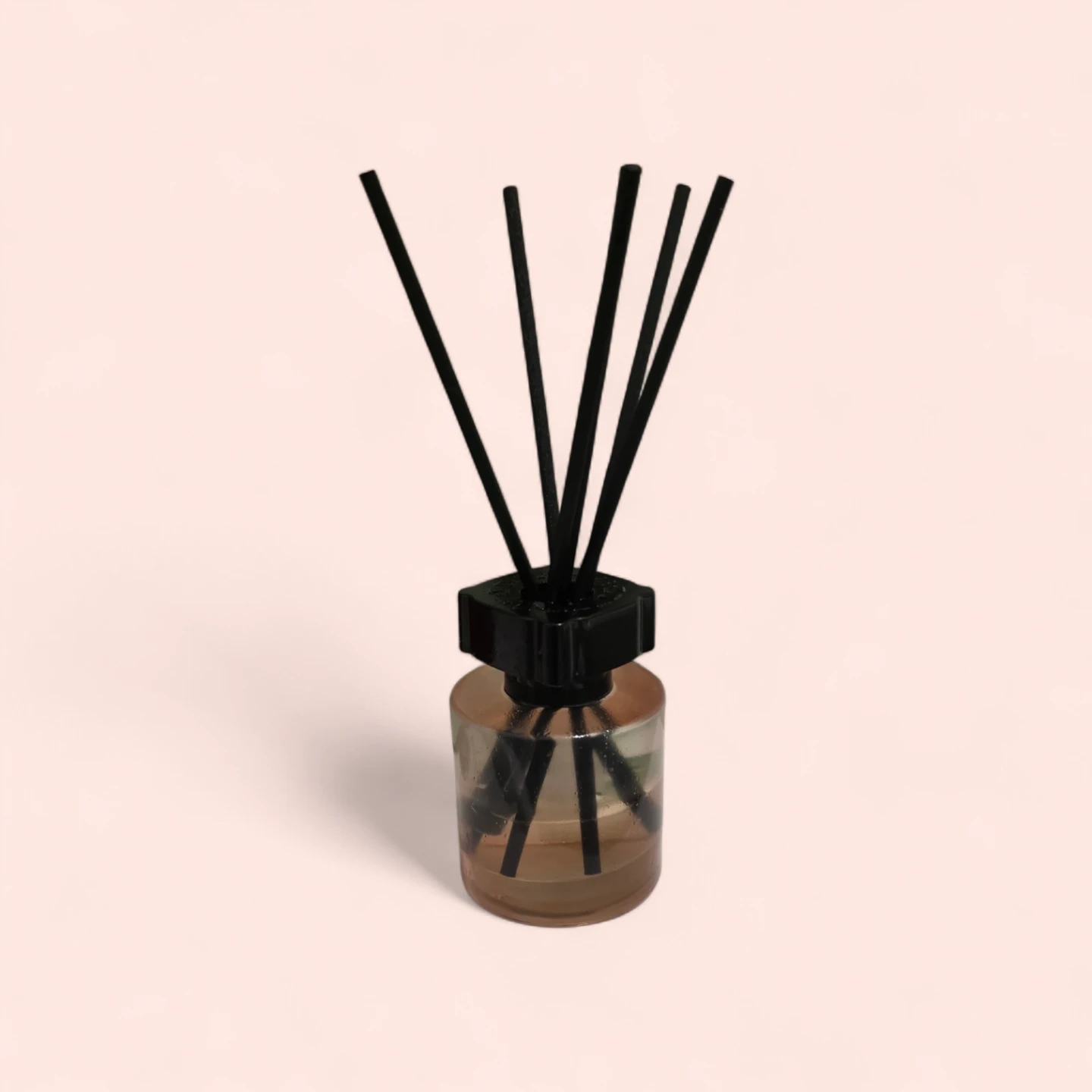 Glass reed diffuser bottle with black reeds. Creates a pleasant aroma for your home. About 15cm tall with reeds.