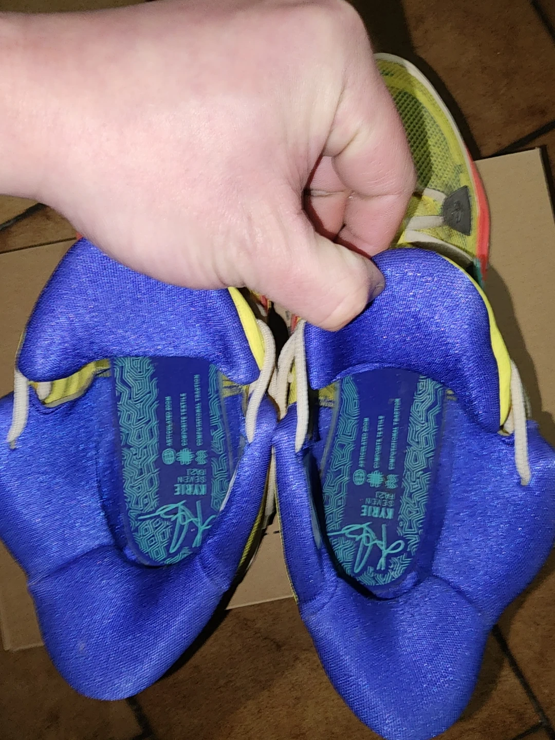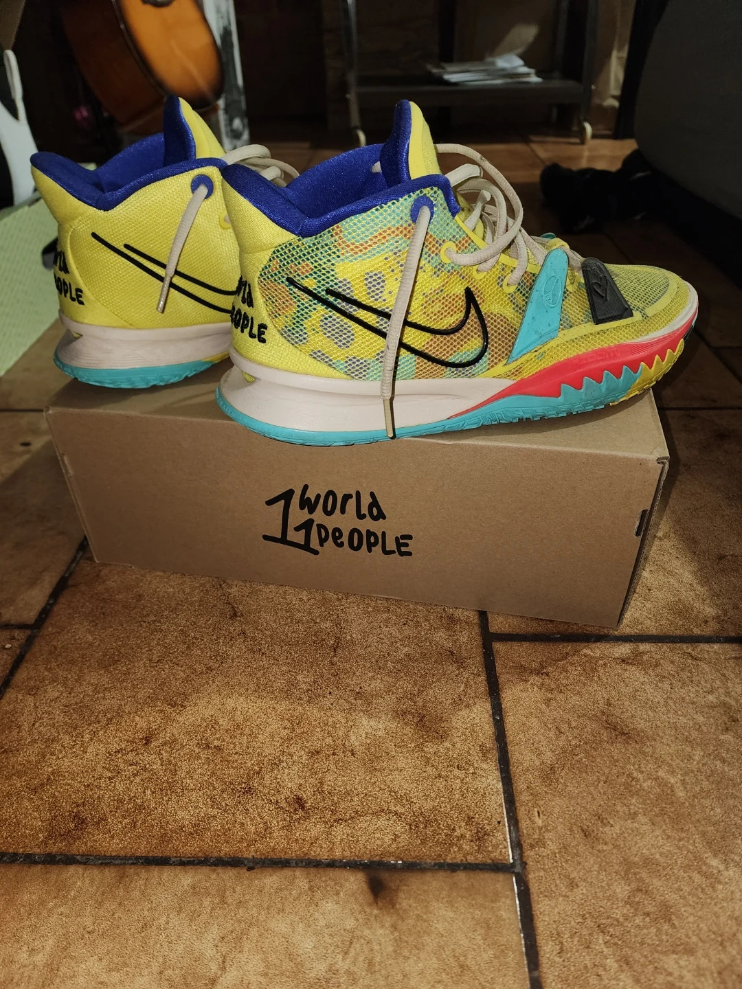 Nike Kyrie 7 basketball shoes in a yellow, blue, and multi-colour design. These feature "1 World 1 People" branding on the heel. Comes with the original box.