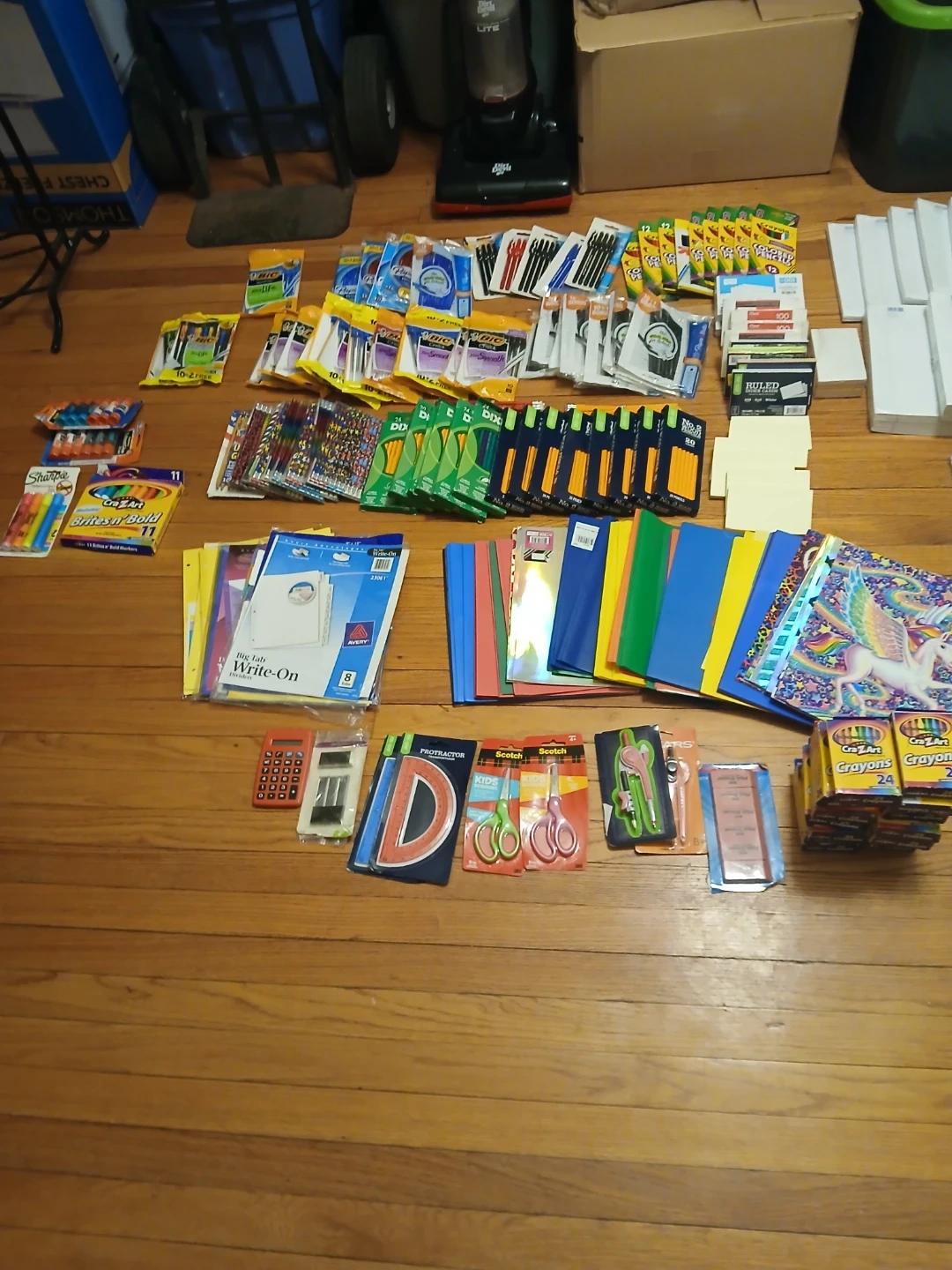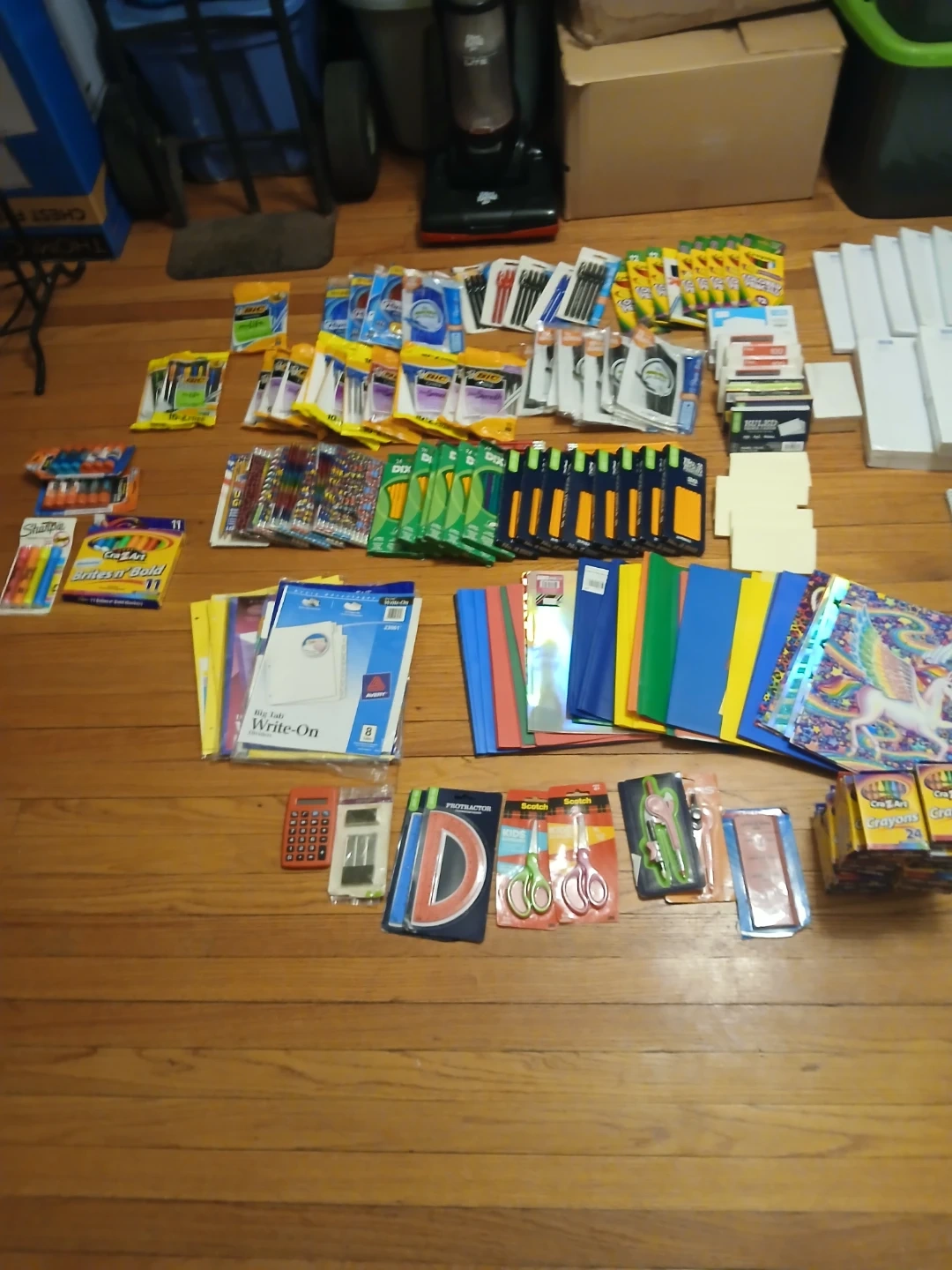 I have a large collection of school supplies for sale. There are notebooks, folders, paper, crayons, pens, pencils, scissors, and more. Perfect for stocking up for the school year!