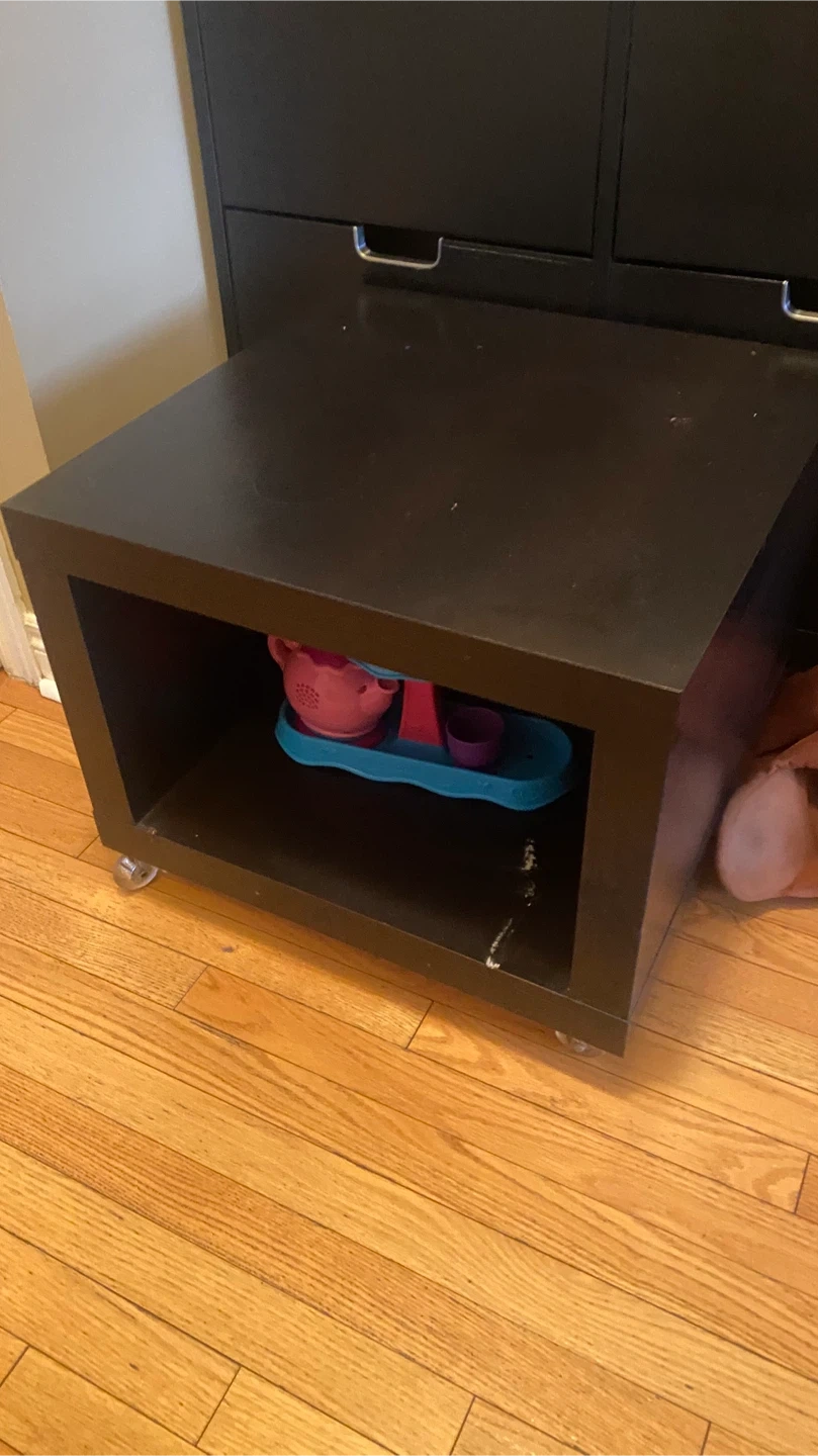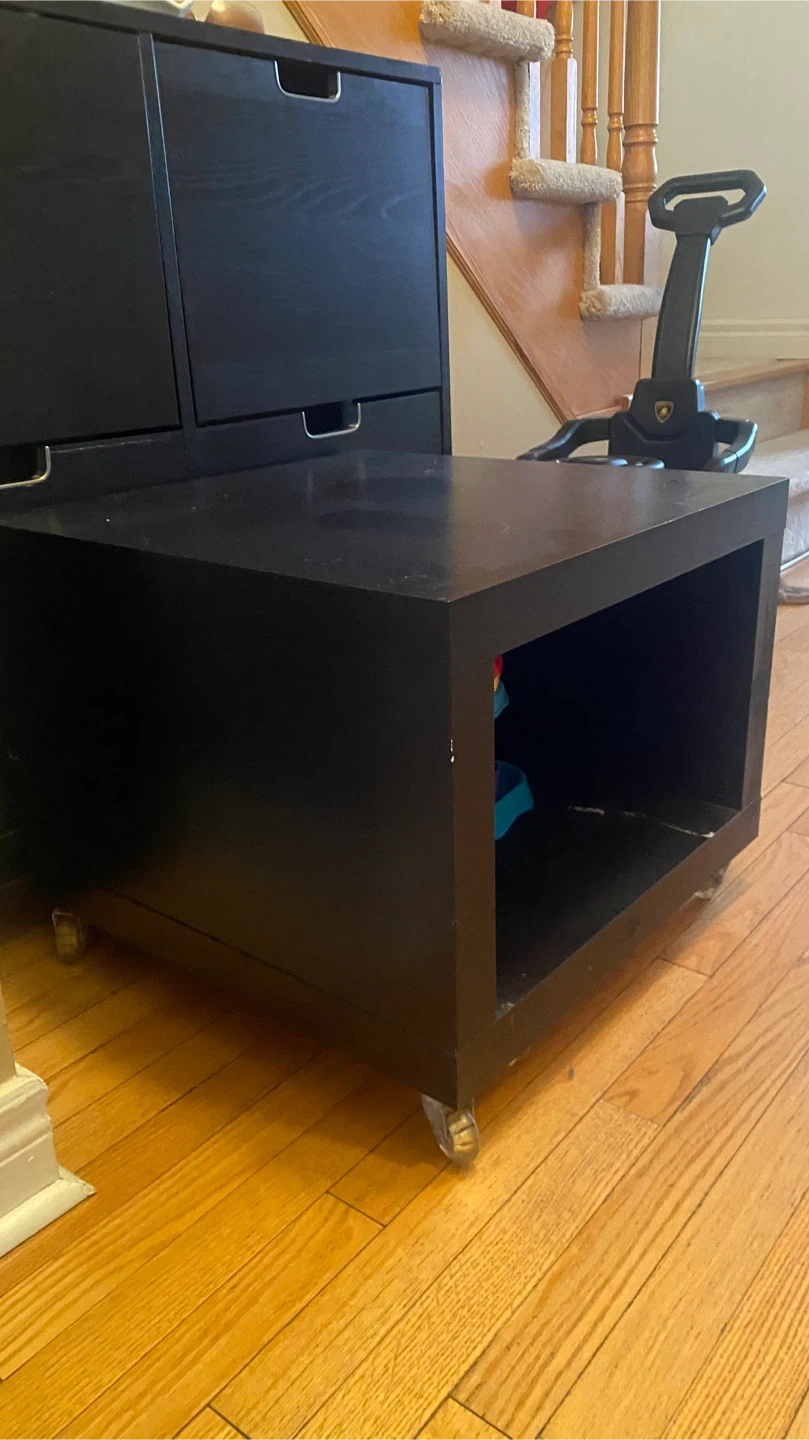 A handy black cube storage side table. It's on wheels for easy moving! Plenty of space inside for storage or display. This table is about 20 inches wide and 20 inches tall.