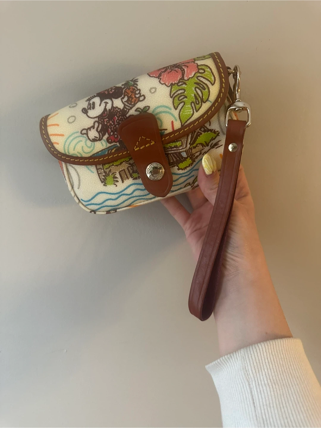 Selling a rarely used Dooney & Bourke wristlet featuring a fun Disney print with Minnie Mouse and Aulani Resort. It's a convenient size for essentials.
