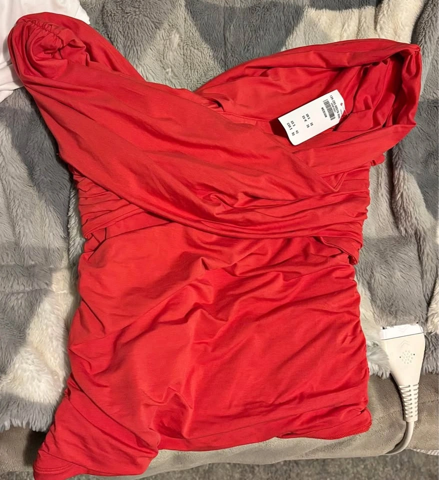 Brand new with tags Abercrombie & Fitch ruched off shoulder top, size M. Original price $50 CAD. Red and white top. Let me know if you're interested!