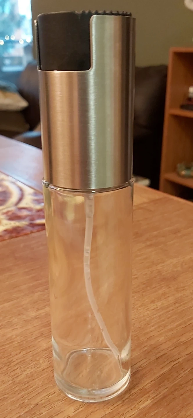 This is a refillable glass oil sprayer bottle with a stainless steel top. It's designed for cooking and baking needs. The clear glass makes it easy to see how much is left inside.