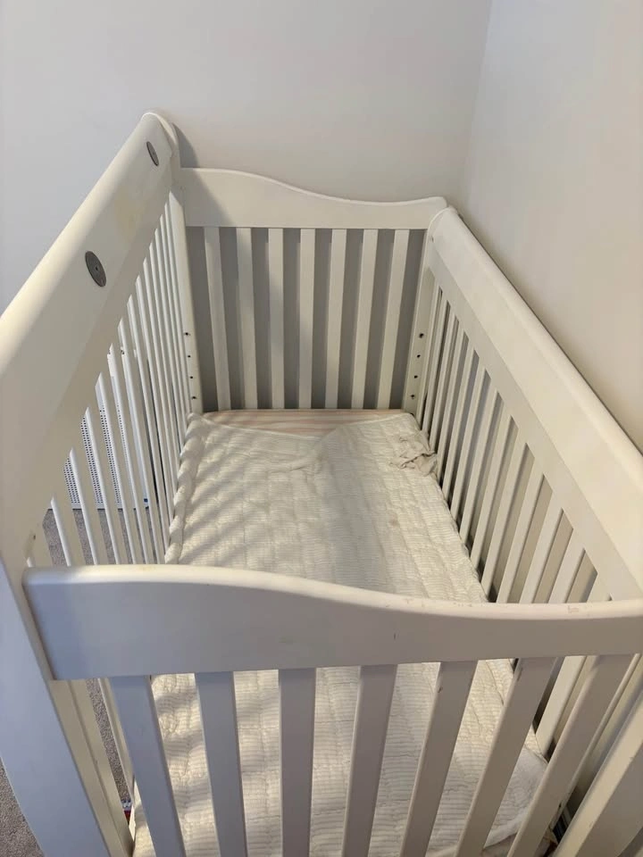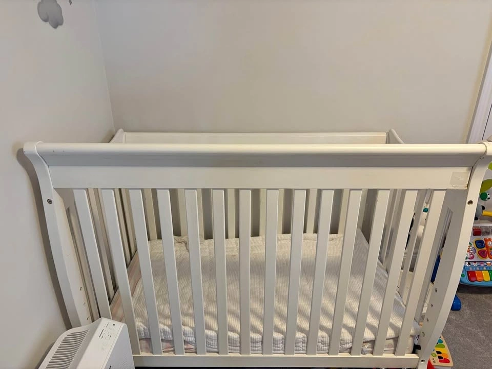 A white standard baby crib. Comes with two mattresses. Missing some screws, use at your own risk. We used it as is and had no problems. Feel free to message if you have any questions!