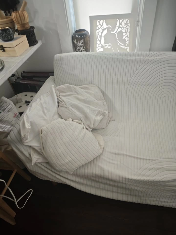 Comfortable futon sleeper couch – great as a couch by day and a bed by night. Good condition, clean, and perfect for small apartments or guest rooms. Black futon with an optional cream cover available for an additional $10. Pickup only.