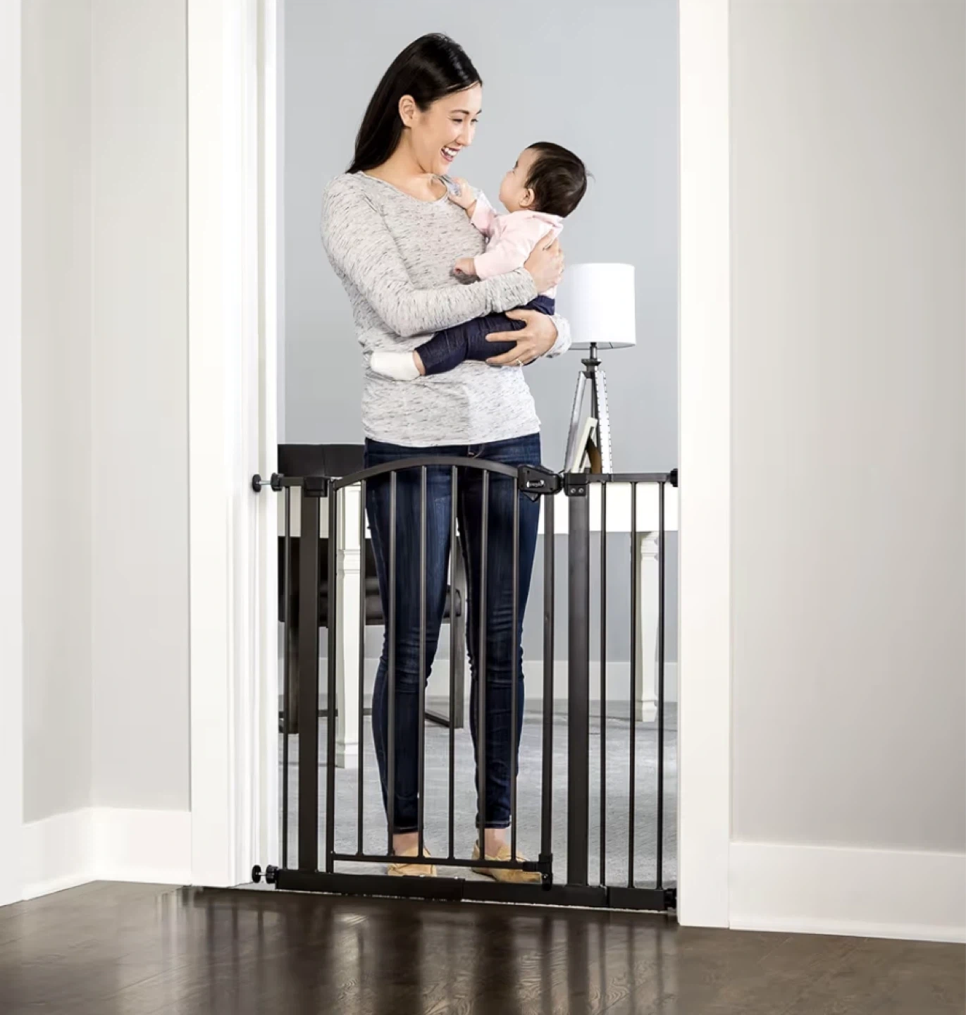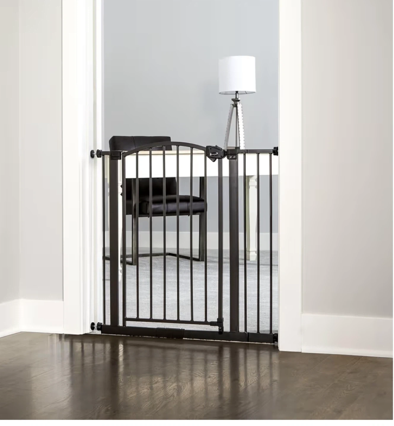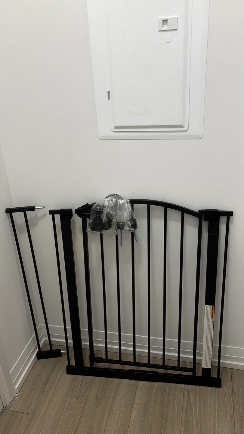 This metal gate is 37 inches tall and adjusts to fit openings between 29 and 30 inches wide. It's made of durable metal with a bronze finish. Includes extra hardware for installation.