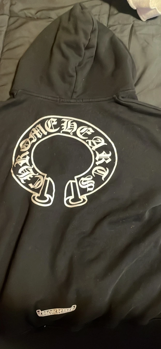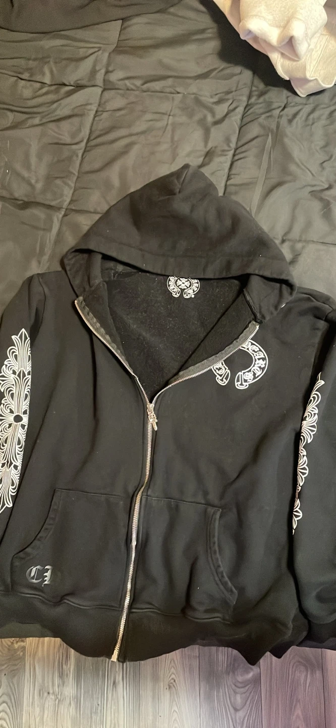This black Chrome Hearts zip-up hoodie features iconic graphics on the back and sleeves. It's made for a comfortable fit. The zipper closure and front pockets add practicality.