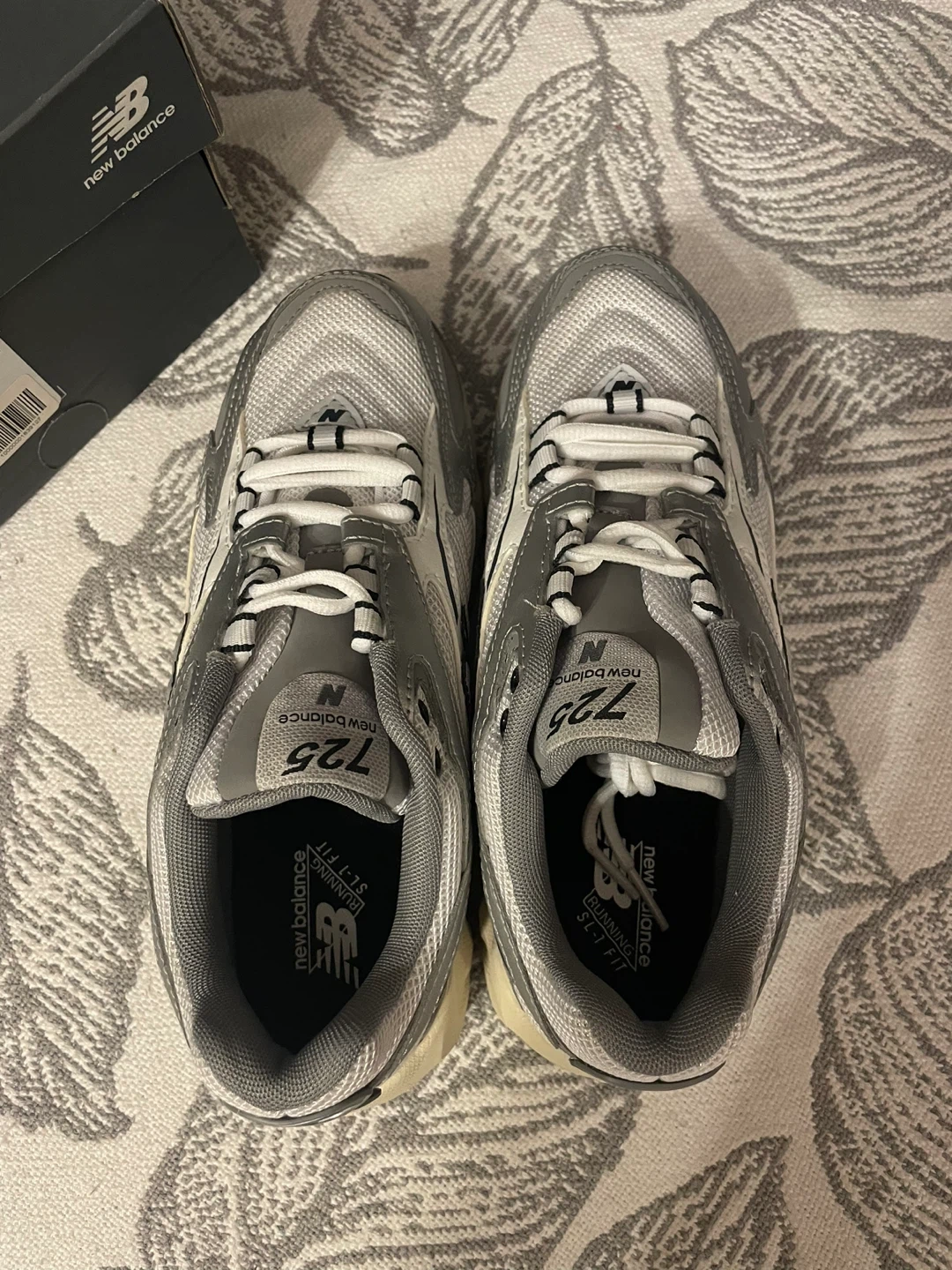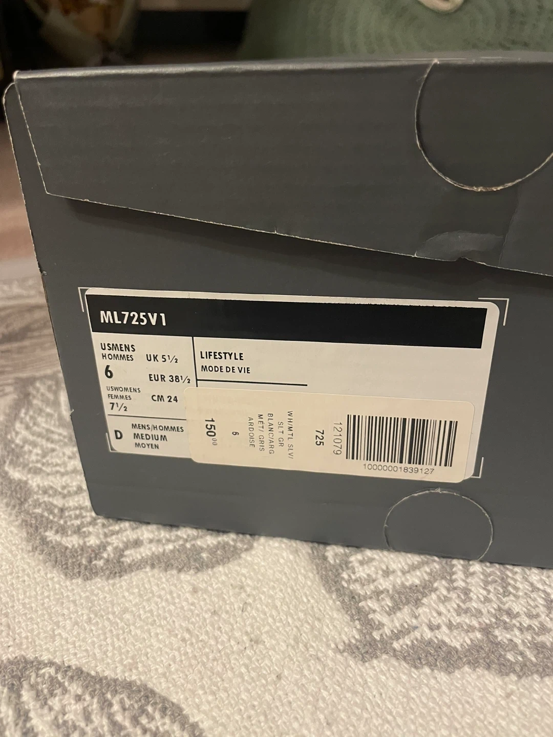 New Balance 725 V1 lifestyle running shoes in silver and grey. These shoes are a US Men's size 6, UK 5.5, EUR 38.5, and CM 24. They come with the original box. This model offers a comfortable fit for everyday wear.