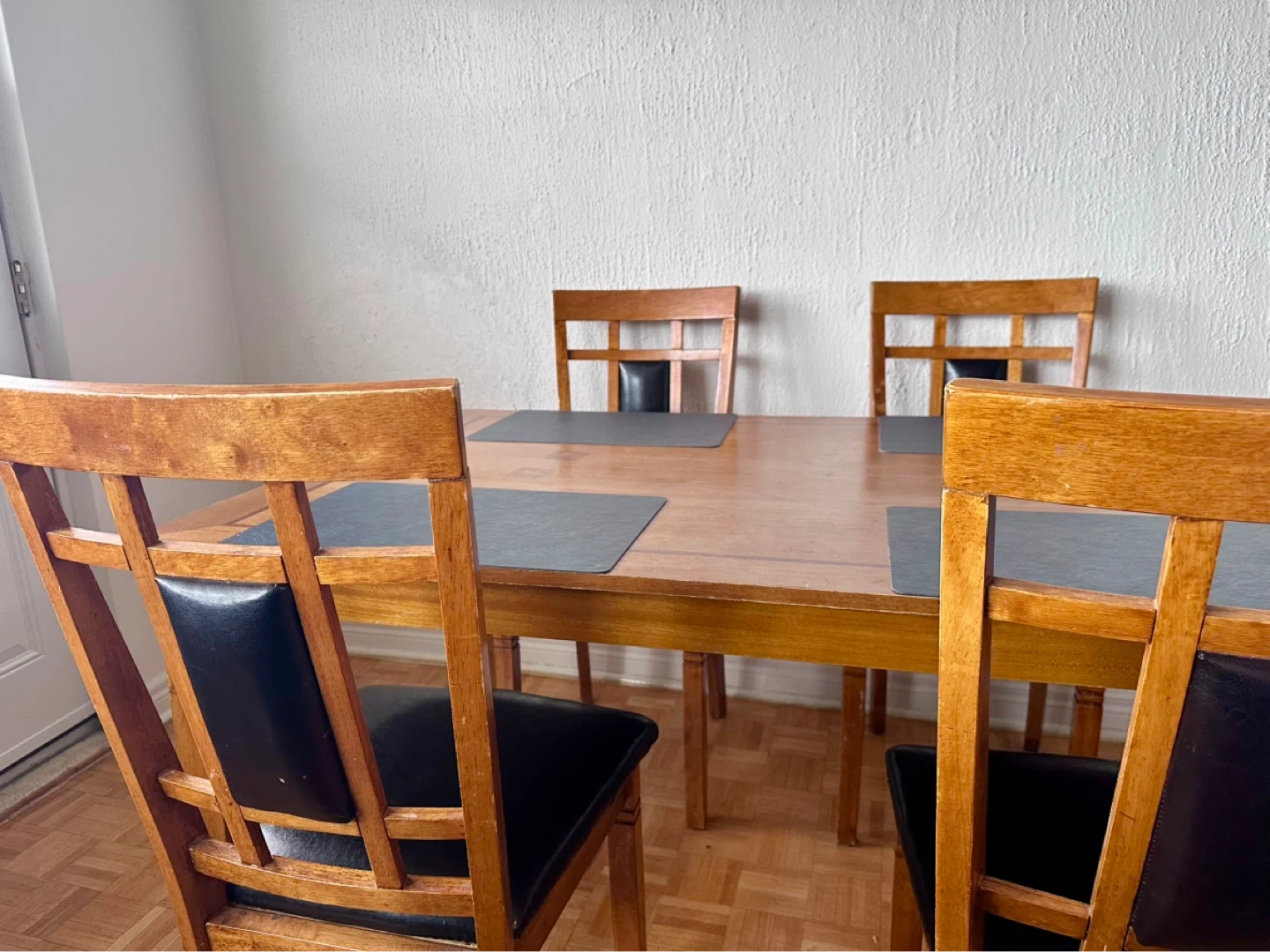 A sturdy wooden dining table with four matching chairs. Each chair has a black vinyl seat. Includes four dark grey placemats. This set is great for smaller dining areas.
