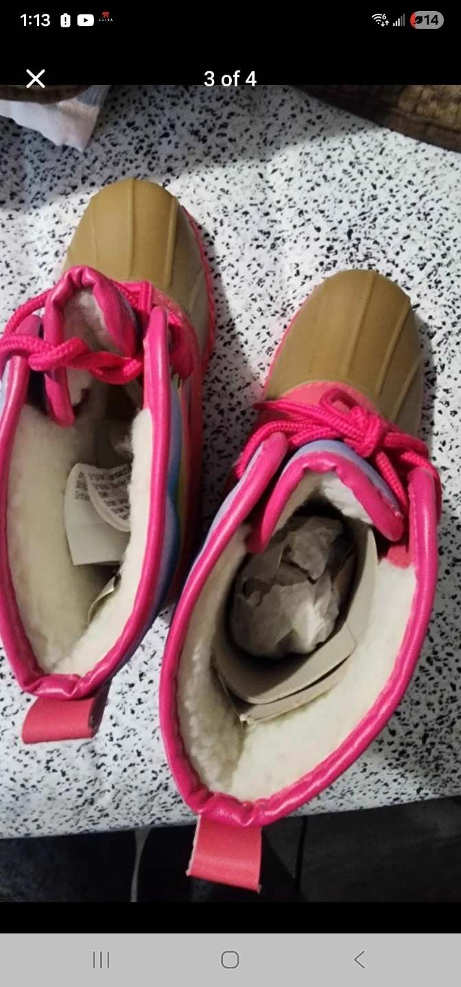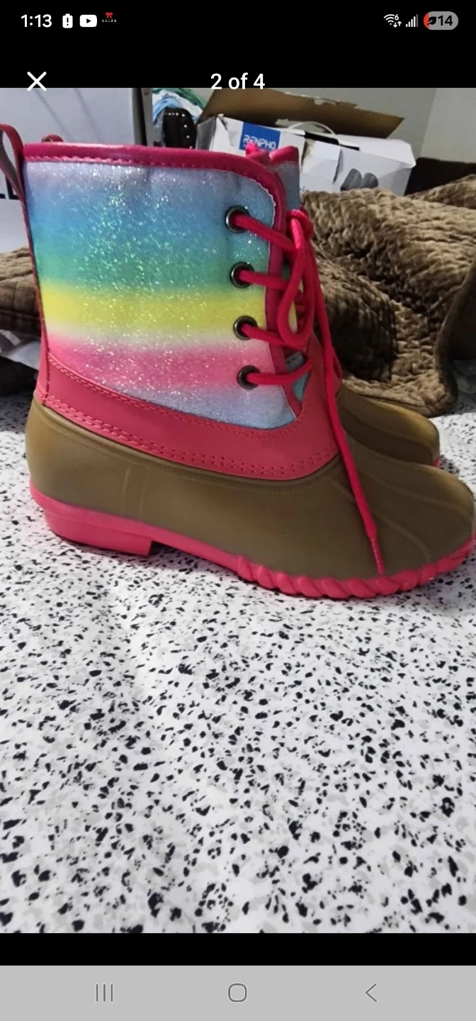 Cute pair of duck boots in a size 4. They feature a rainbow glitter upper and pink soles and laces. Perfect for puddle jumping!