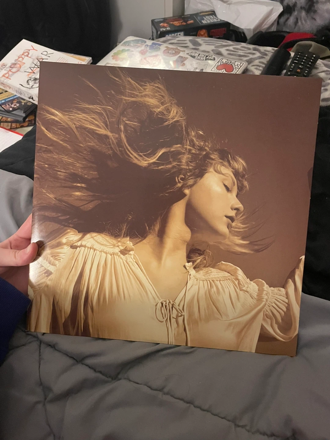 Taylor Swift's Fearless (Taylor's Version) vinyl record. It features the re-recorded tracks from her original album, plus vault tracks. 3 vinyls are included, all gold in colour. None of them have ever touched a needle.