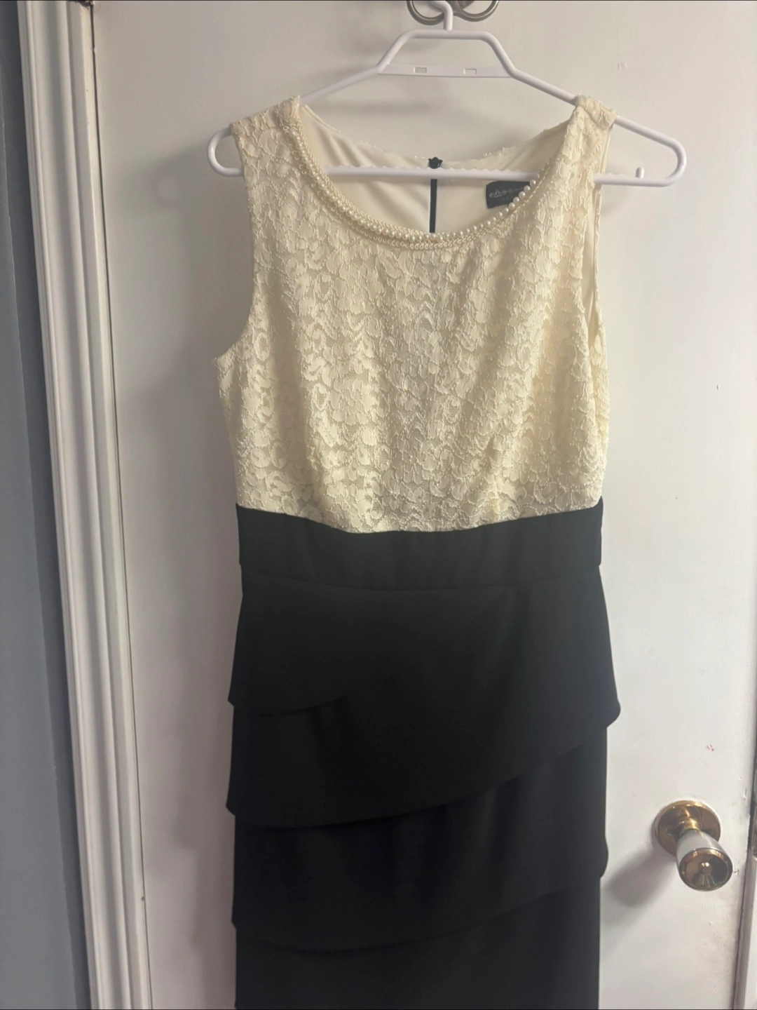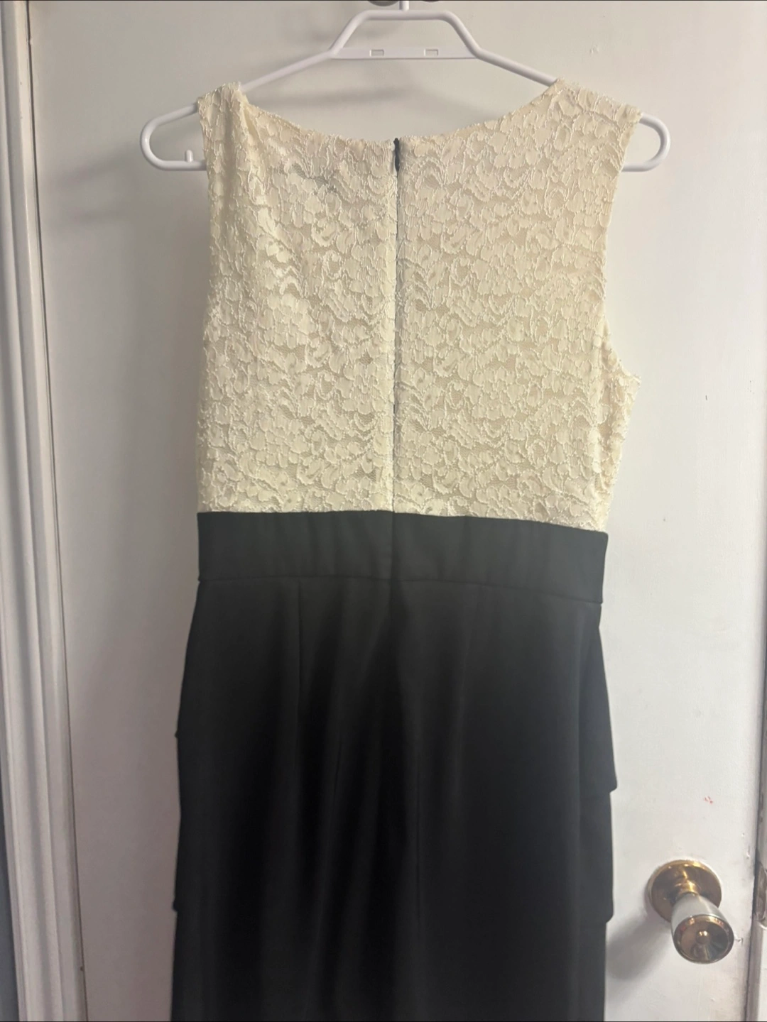 Selling a lovely Adrianna Papell dress! It features a cream-coloured lace top and a tiered black skirt. It's in great condition and perfect for a special occasion. Size 8