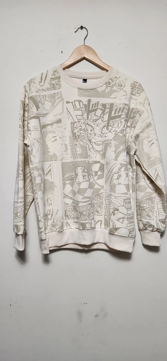 Cream coloured crewneck sweater with a graphic manga print. It's a comfortable pullover style. Crewneck, long sleeves, and ribbed cuffs and hem.