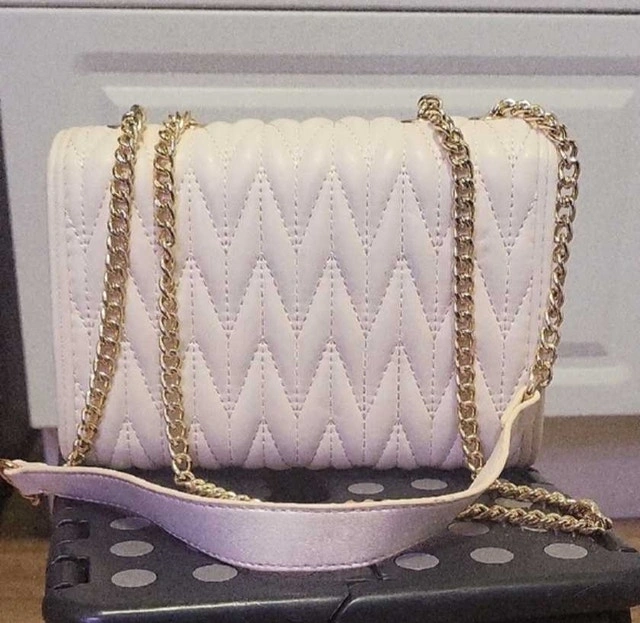 This chic white quilted purse is the perfect accessory to elevate your style, featuring a distinctive heart-shaped closure and a sleek gold chain strap. As shown in the pictures, the purse is in used but good condition, ready to add a touch of elegance to your ensemble. Specifications: * Colour: White * Style: Quilted with gold chain * Closure: Heart-shaped twist lock. Cash accepted.