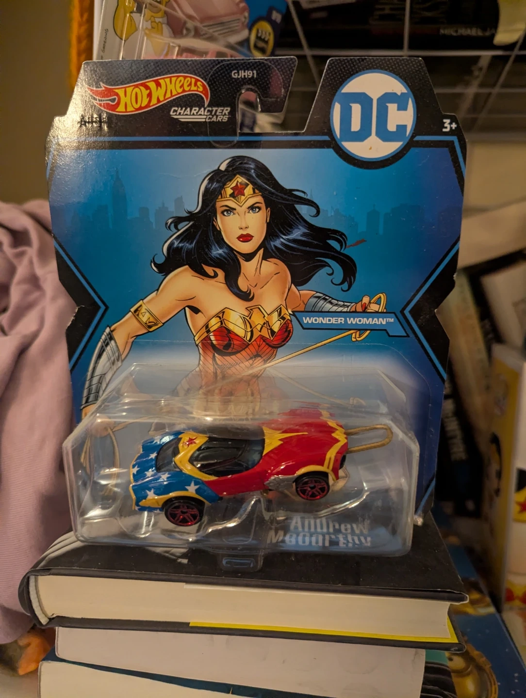 Hot Wheels Character Cars line featuring Wonder Woman. This die-cast car is designed with Wonder Woman's iconic red, gold, and blue colours and stars. It's new in packaging.