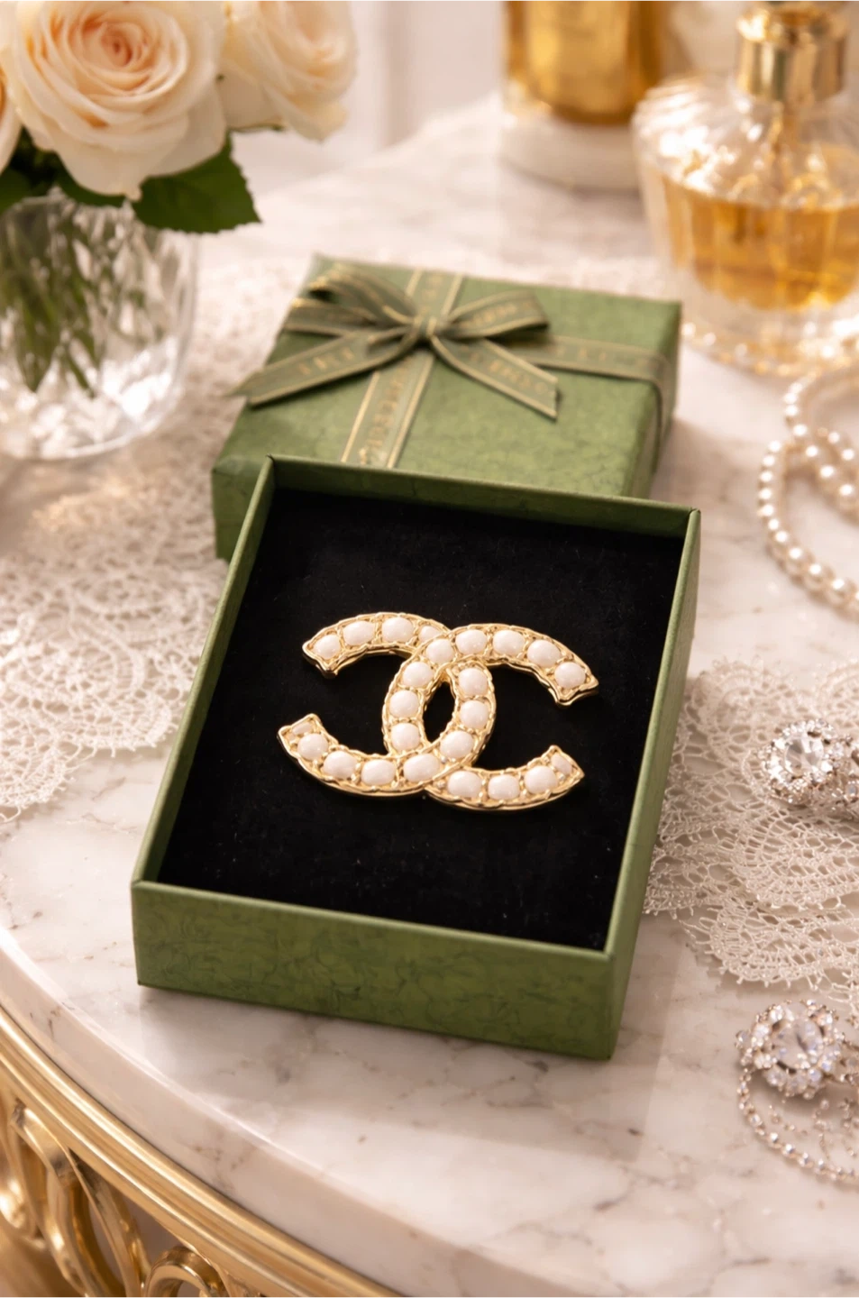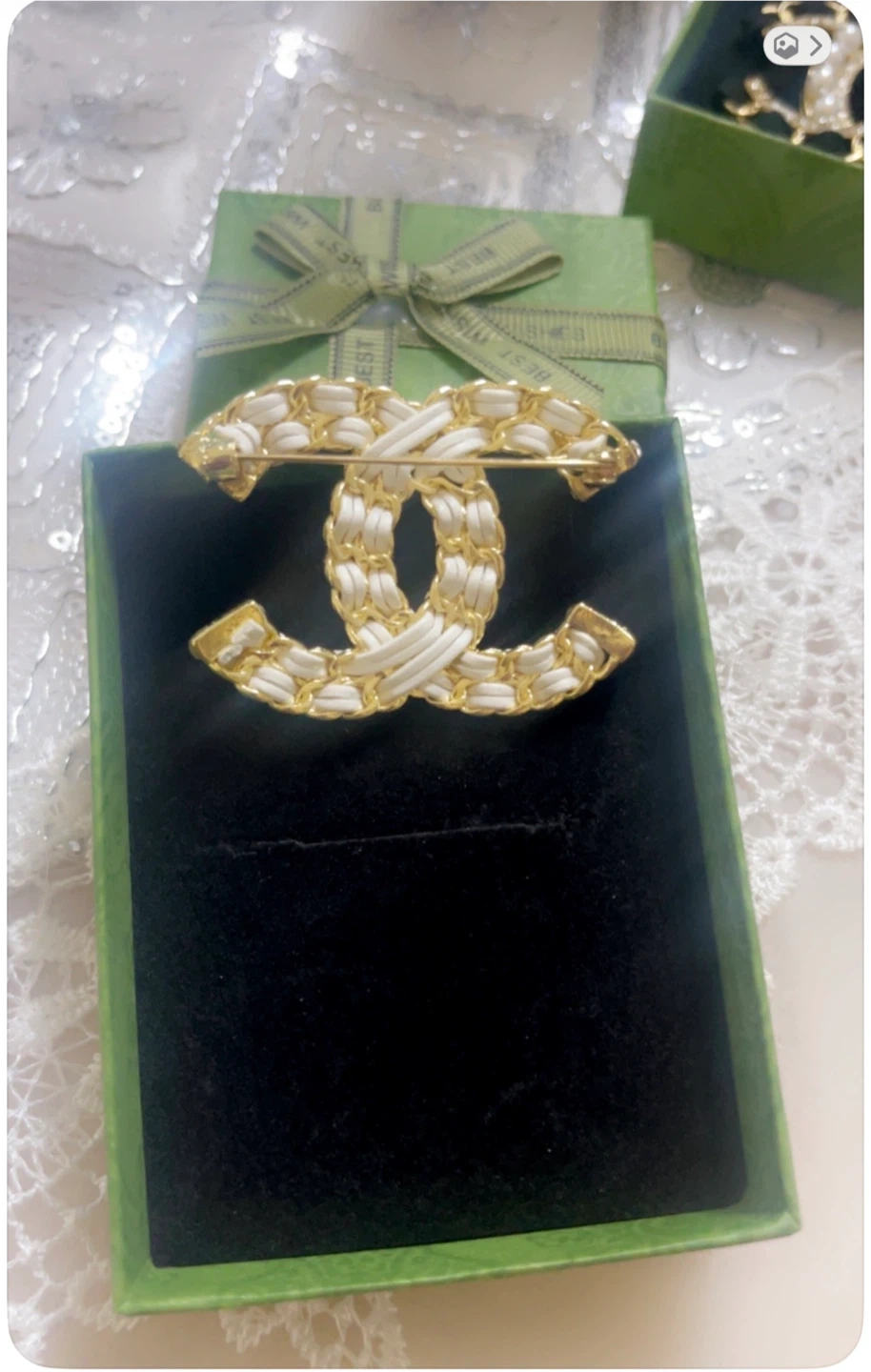 This is a Chanel CC logo brooch. It's gold-tone with white chain detailing and small crystal accents. Comes in its original box!