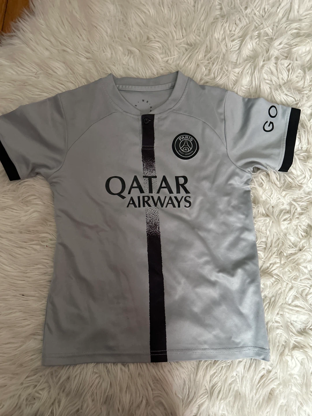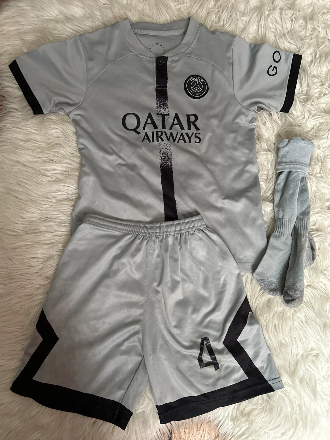 This is a Paris Saint-Germain jersey and shorts set featuring Sergio Ramos' name and number 4. It includes a pair of grey socks. Great for any young fan of PSG!