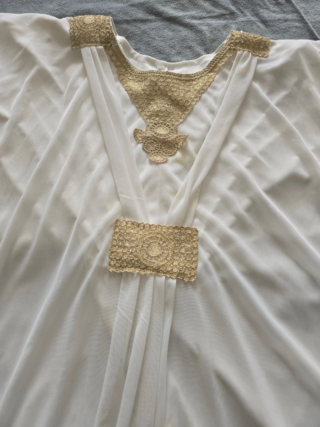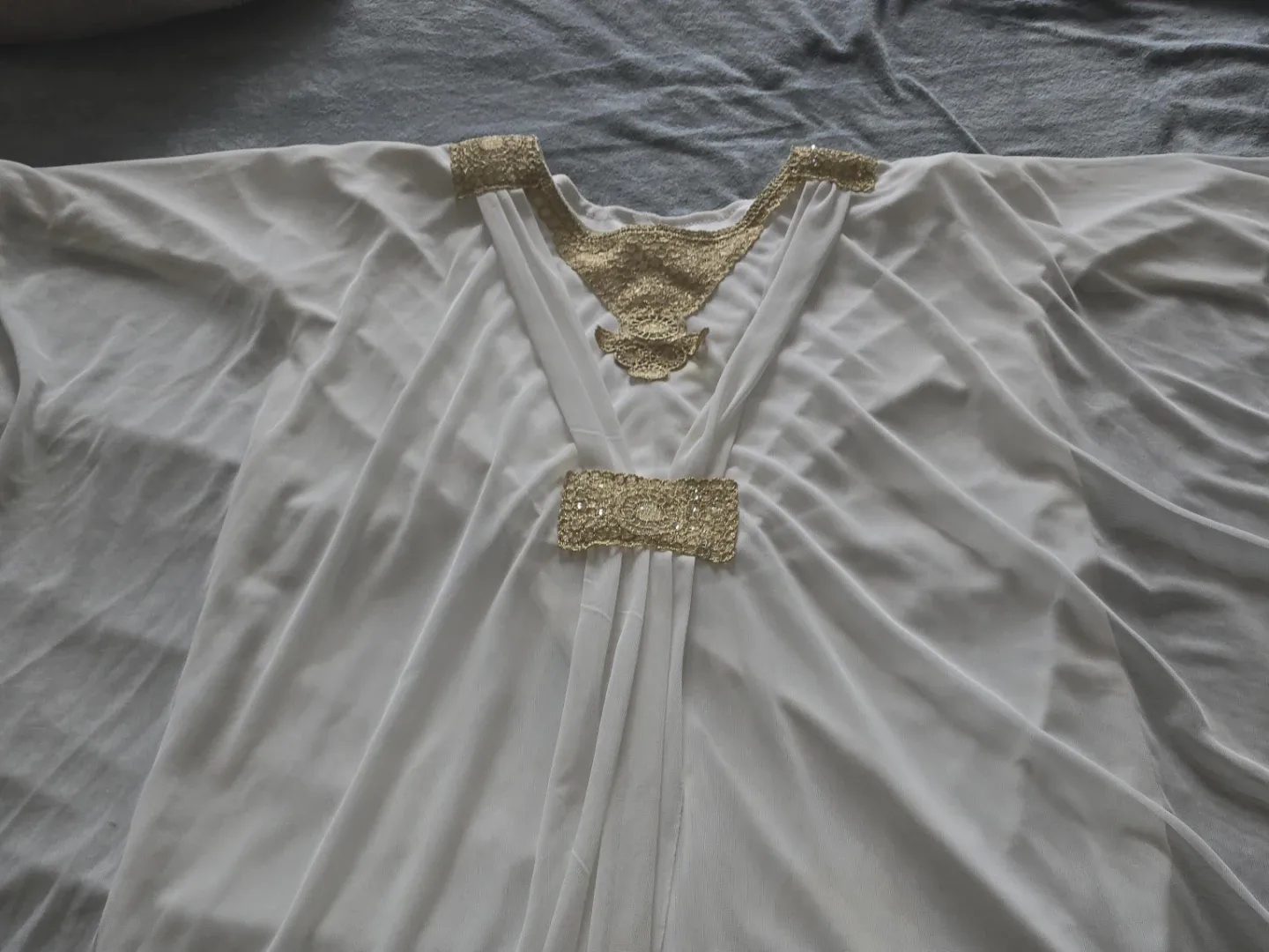 A flowing white kaftan adorned with intricate gold lace and beadwork. This garment features a V-neckline with decorative gold trim and embellished cuffs. It's made of a lightweight, sheer fabric, perfect for warm weather occasions.
