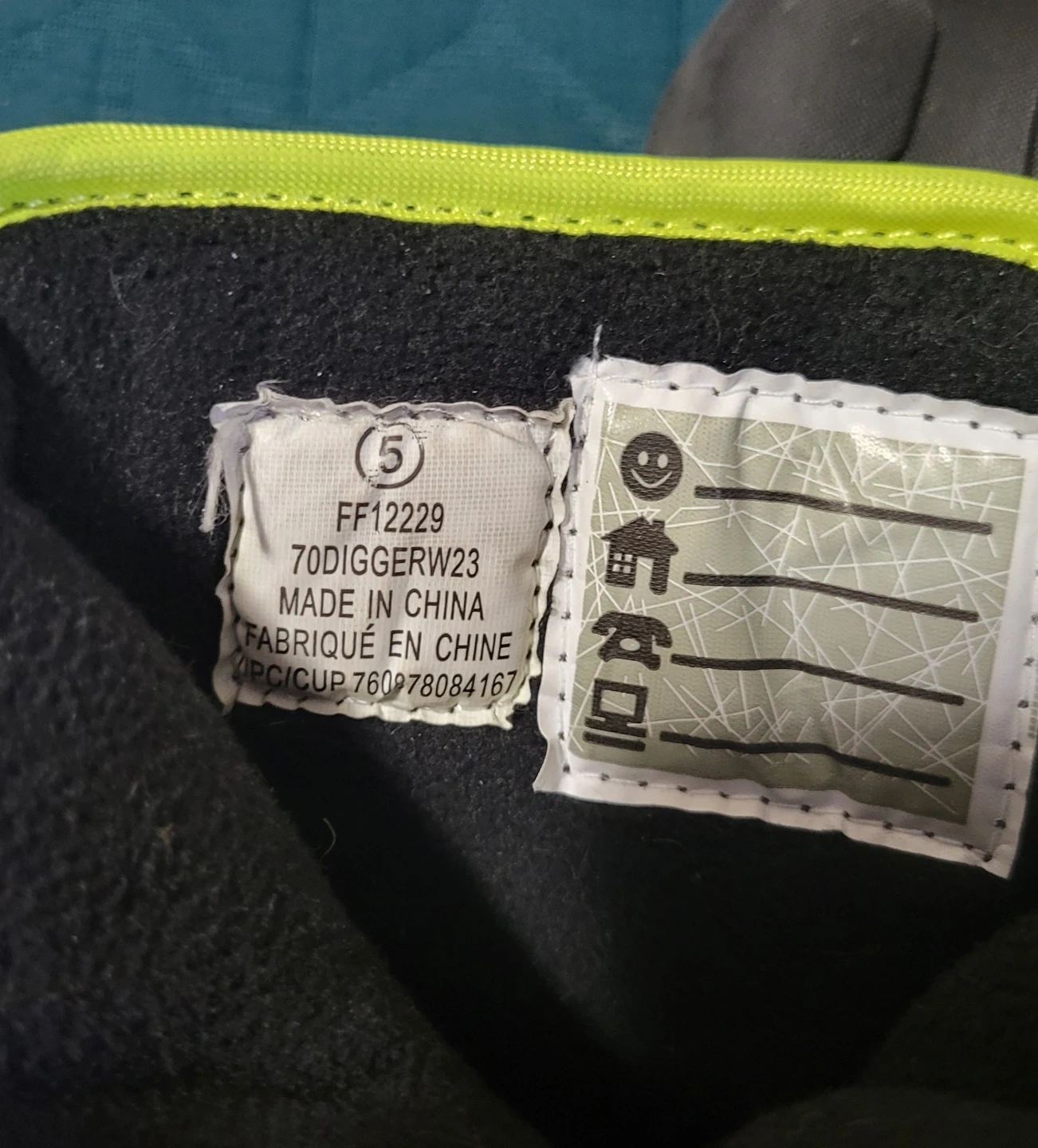 Black and neon yellow winter boots for kids. Waterproof construction with a digger graphic on the side. Features a hook-and-loop closure for easy on and off. Size is 5.