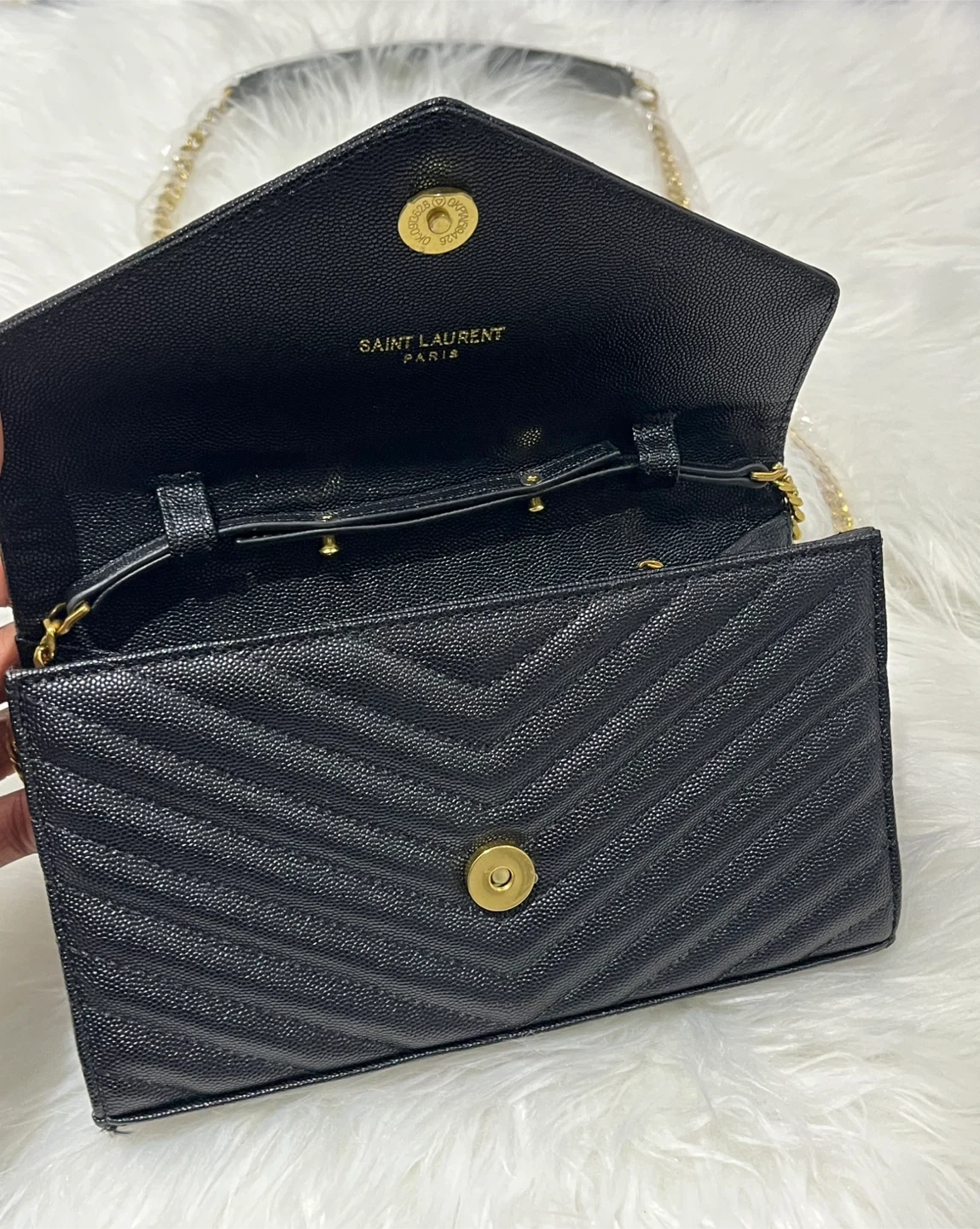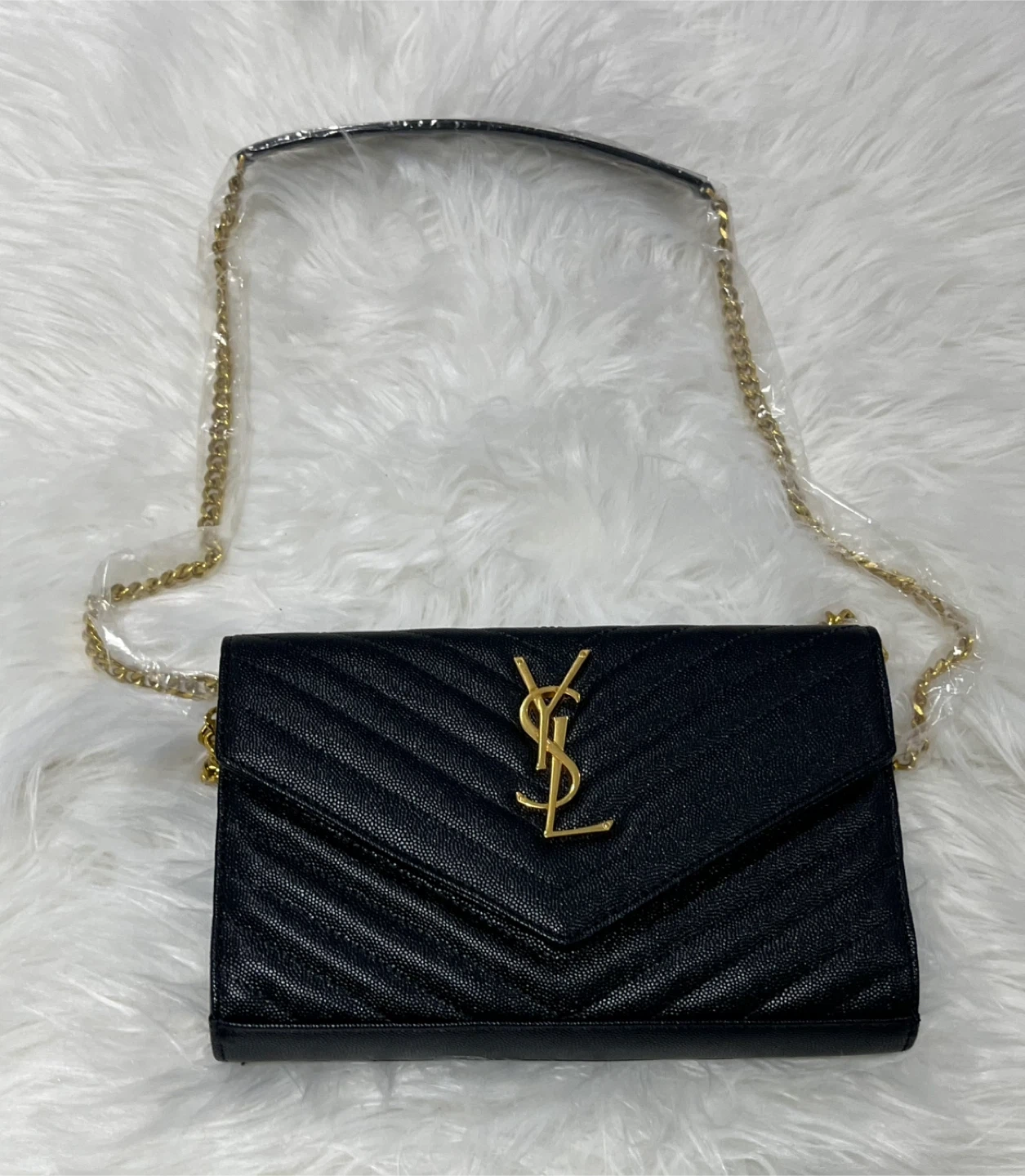 This is a black leather chain wallet with a chevron pattern. It has a gold YSL logo closure on the front and a gold chain strap. The interior is lined with Saint Laurent Paris branding. It's a stylish accessory for your essentials!