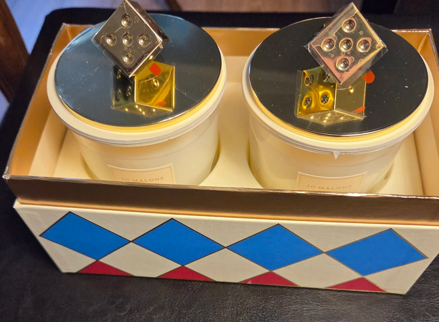 Jo Malone London Decorative Duo Scented Candles. Each candle features a unique dice-shaped lid for a decorative touch.