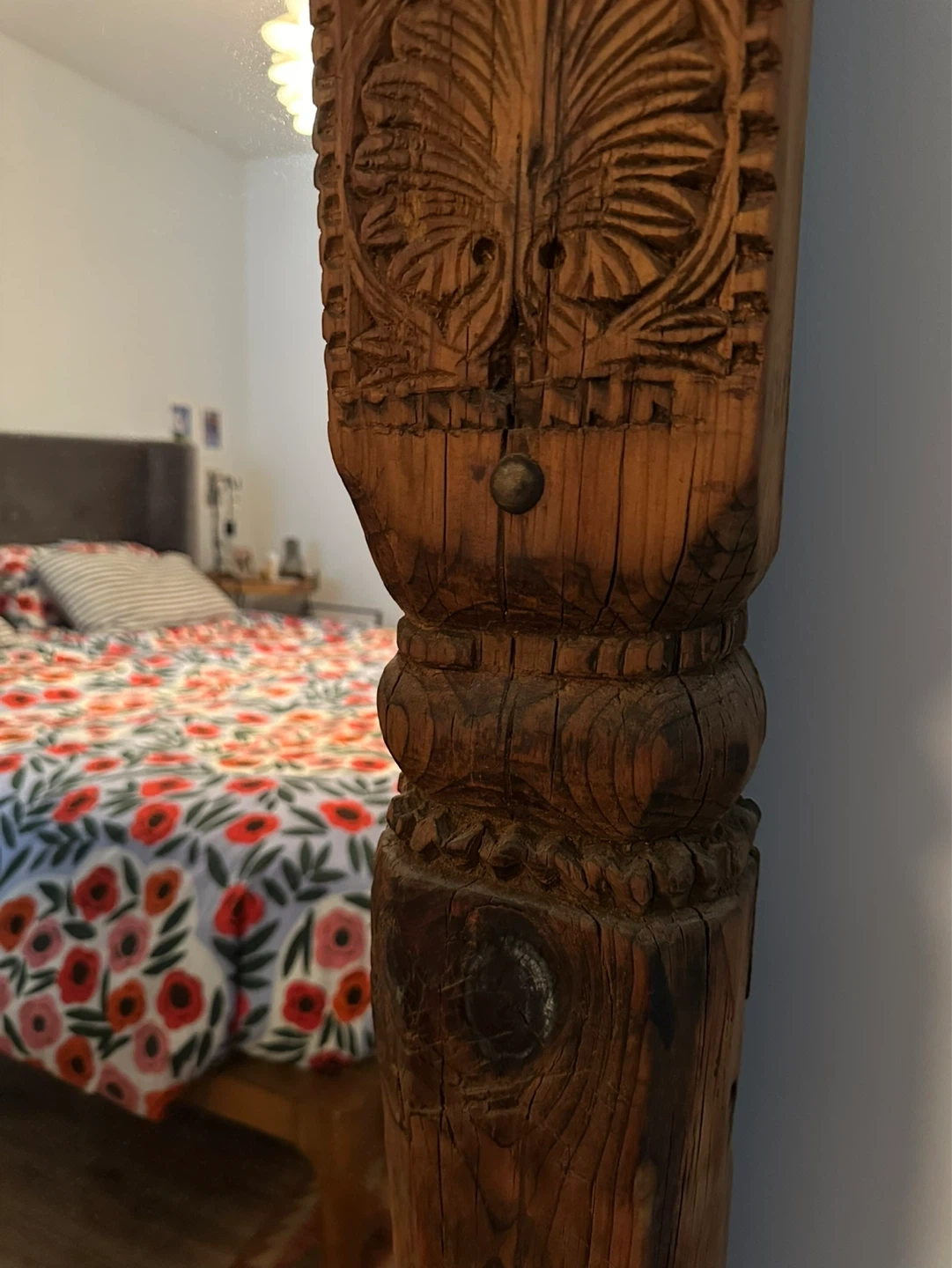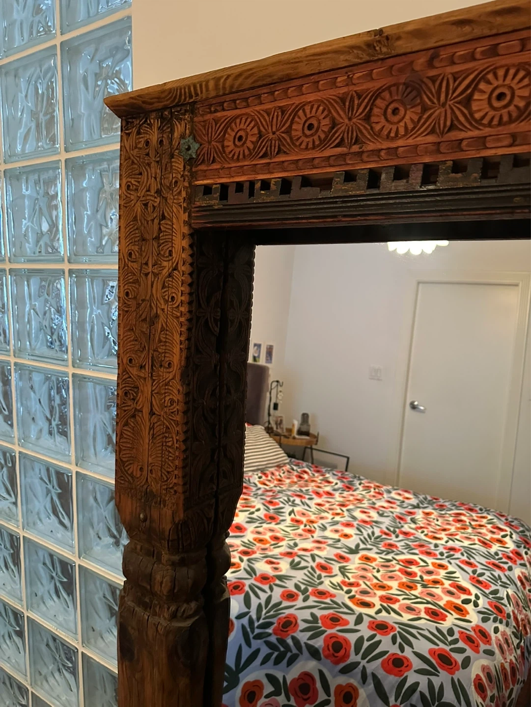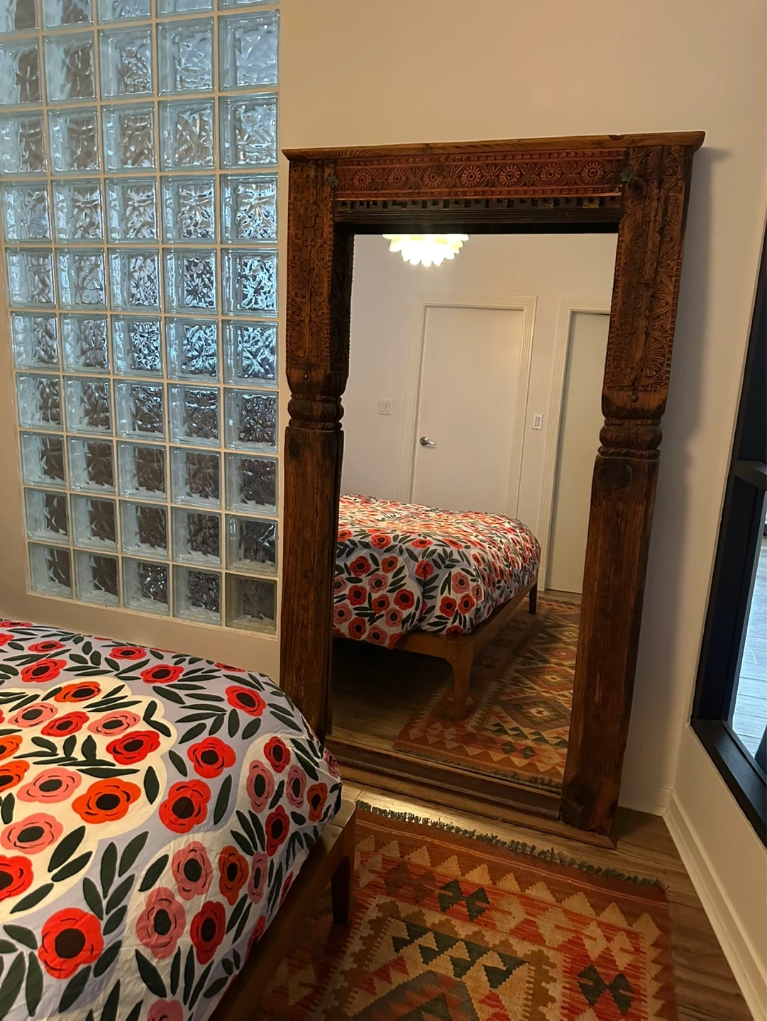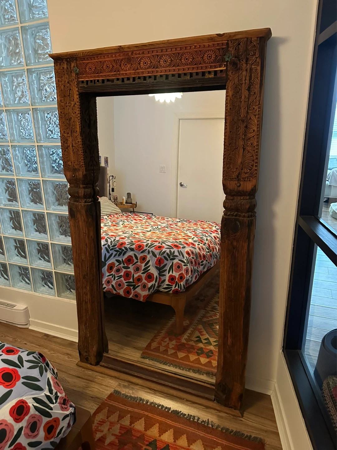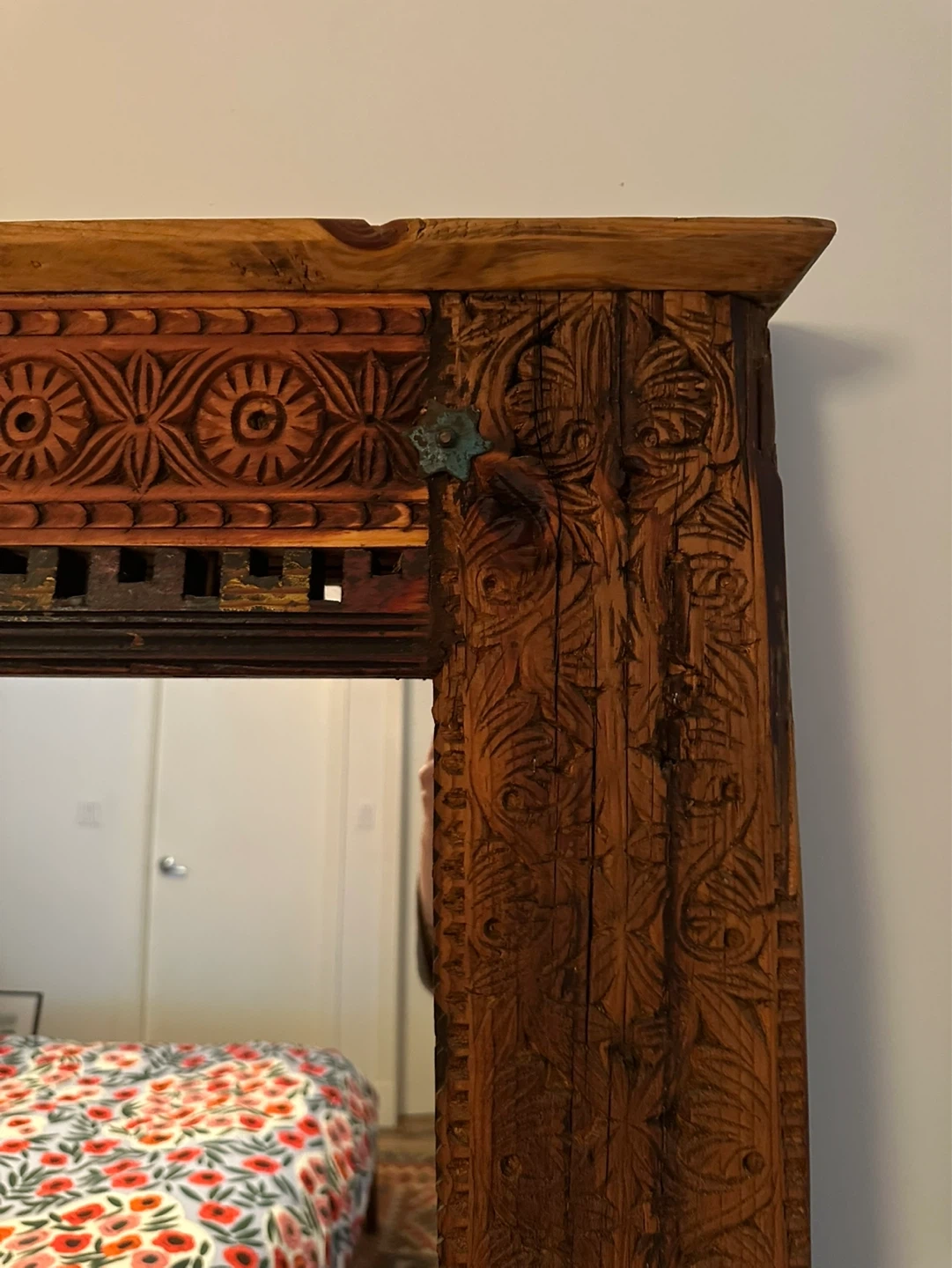 Stunning hand-carved Sulemani-style mirror from Pakistan, repurposed from an old door frame. Its bold carved pillars and intricate detailing make it a statement piece for any room. Perfect for bedrooms, living rooms, or entryways.