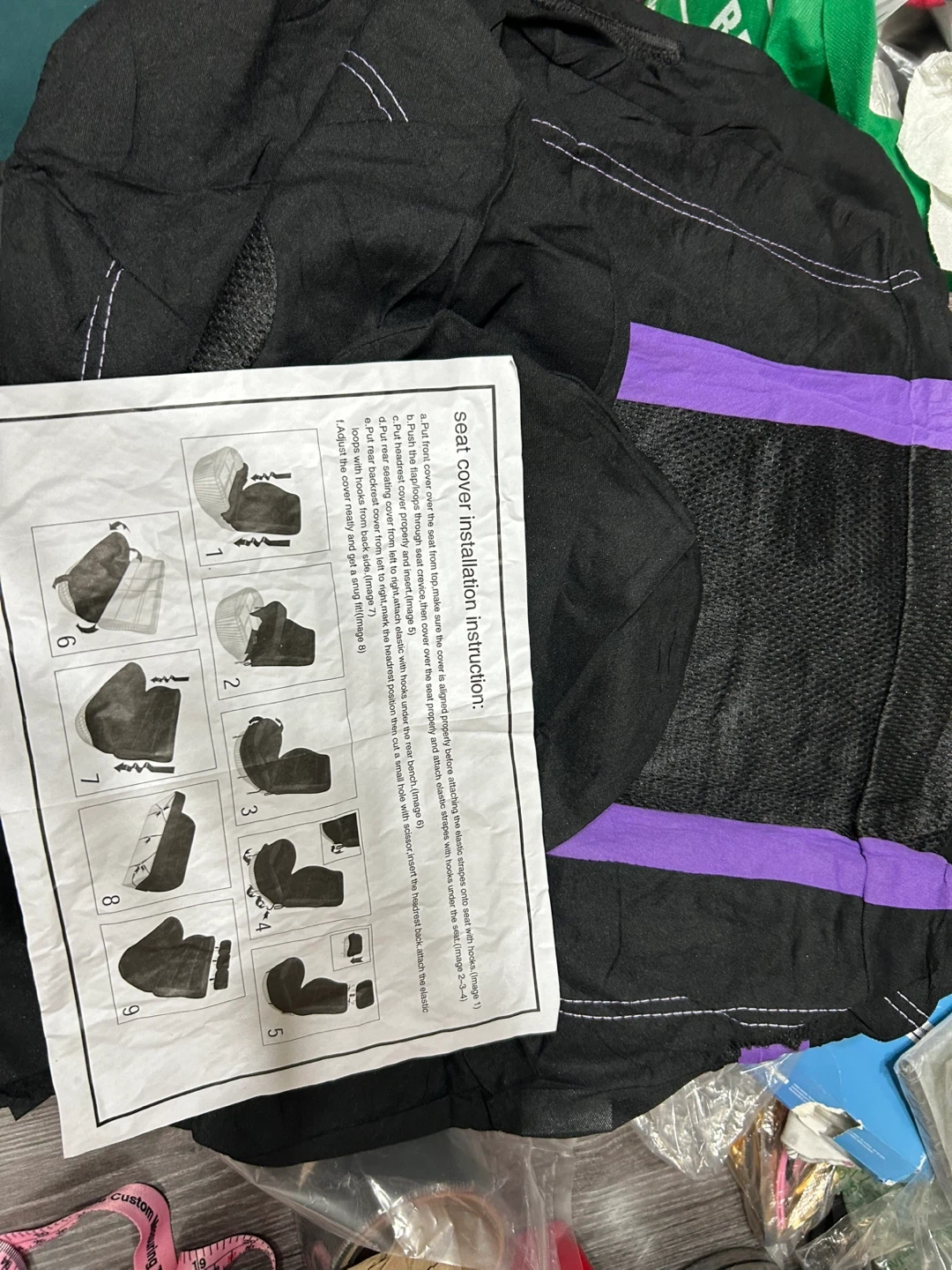 Protect your car seats with this set of black and purple seat covers. They're made from durable material and include installation instructions. This set is great for keeping your vehicle's interior looking sharp!