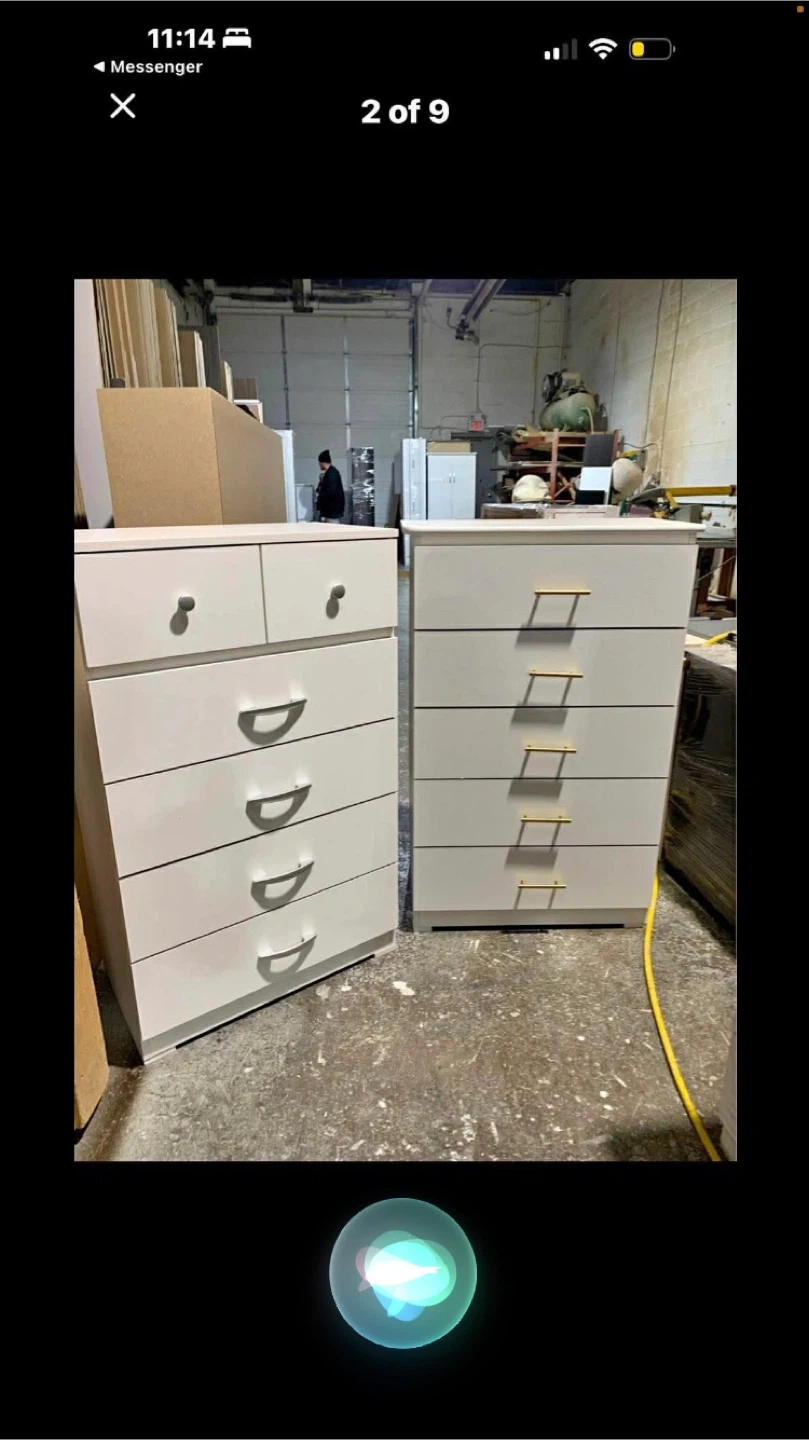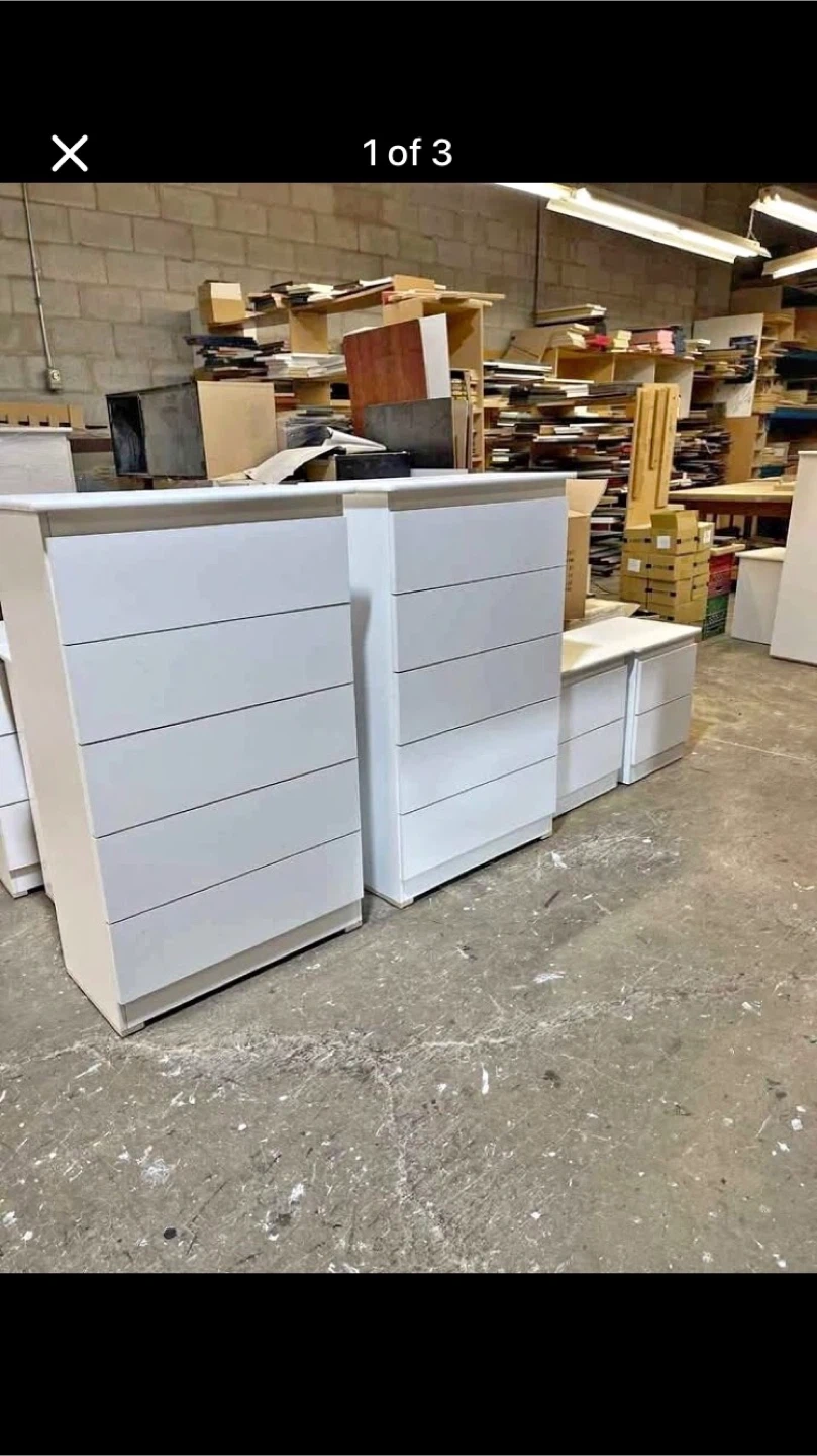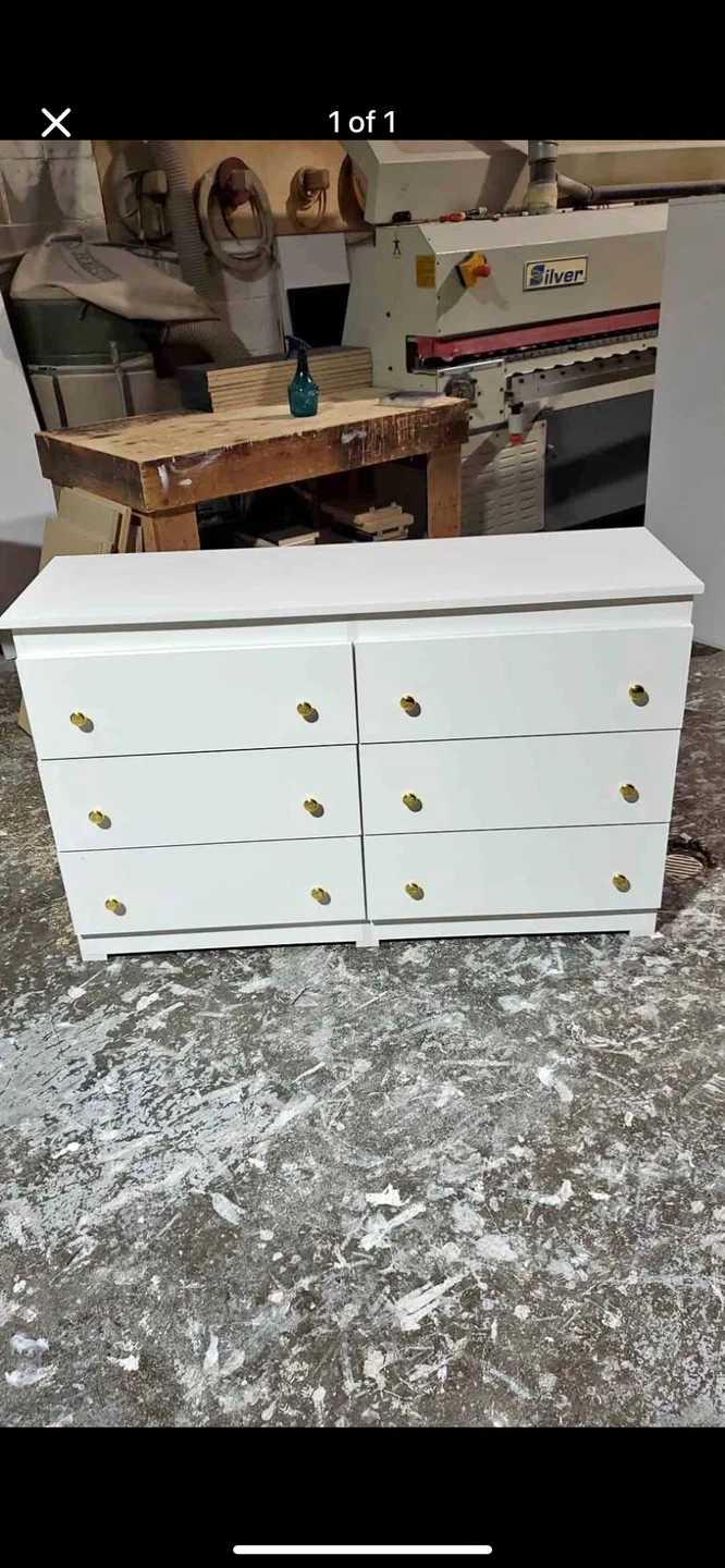 White dresser with six drawers. It has gold-coloured drawer pulls. This dresser offers ample storage space for clothing and linens.