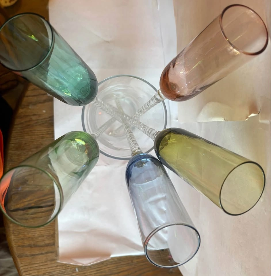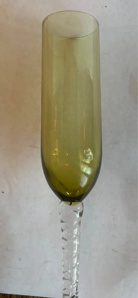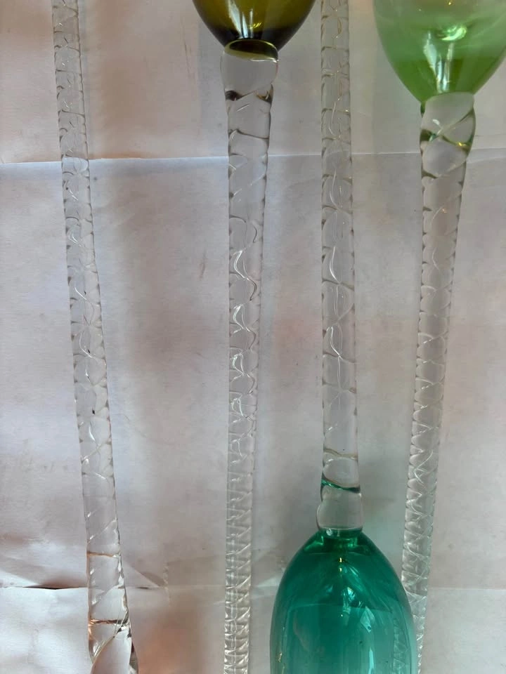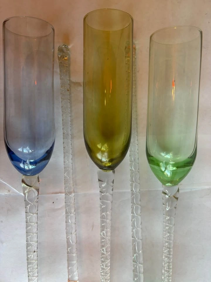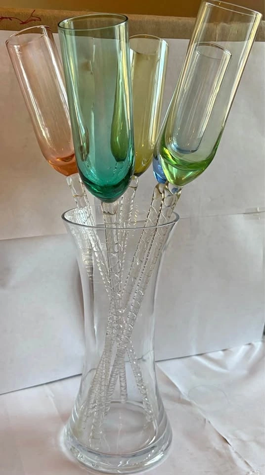 Set of 5 hand-blown, long-stemmed, colored champagne flutes with a glass holder. The flutes are 17 inches tall. One flute has a small, half-inch scratch in the middle. The holder also has some scratches around the middle, likely from normal use. These are hard to see in the photos (pics 7 & 8). I can send more pictures if needed.
