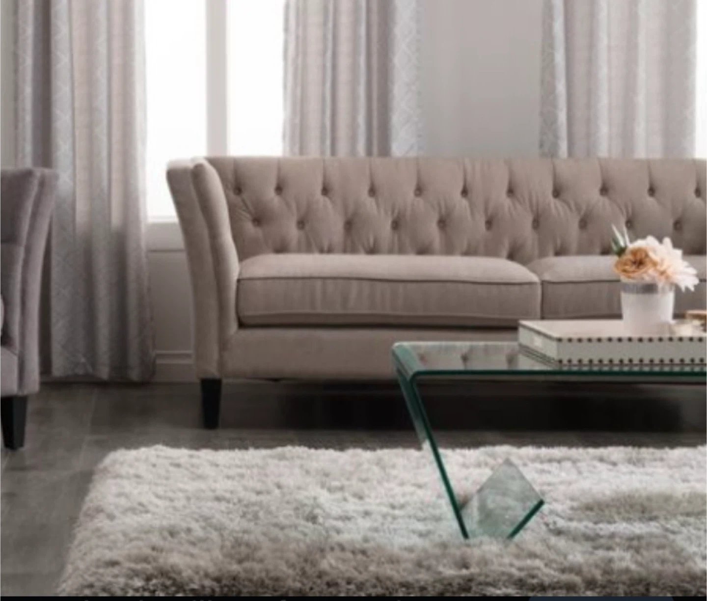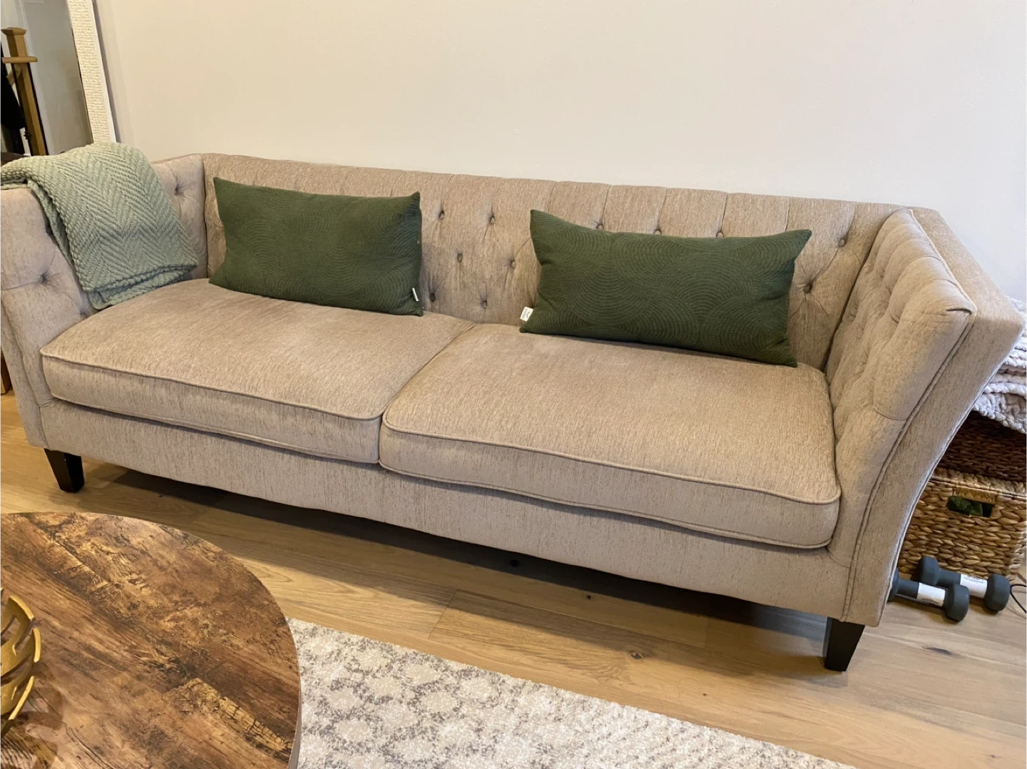 Selling a tufted sofa in a neutral colour. It's in good condition and would be a great addition to any living room. The sofa features classic tufted detailing and comfortable cushions.