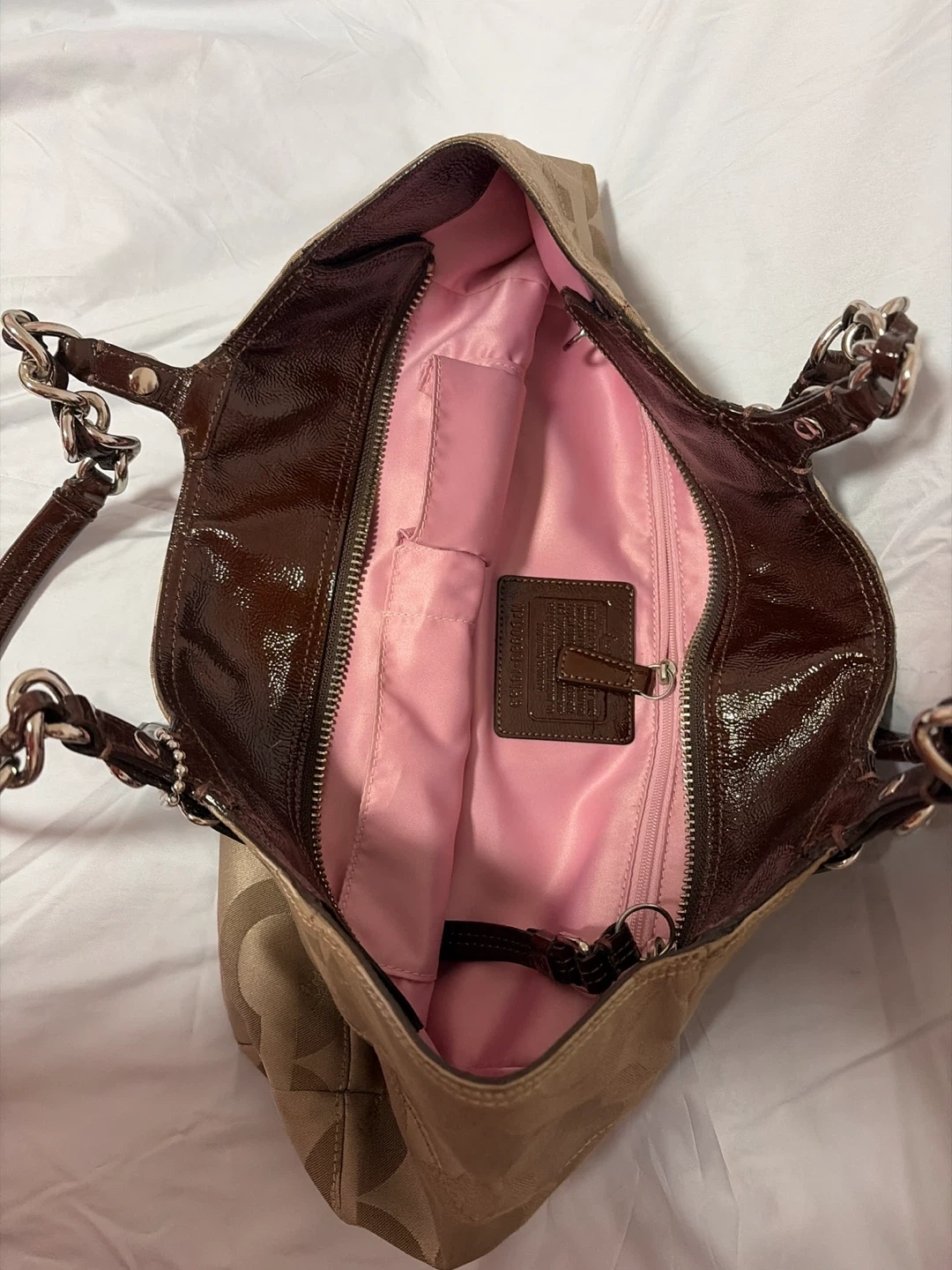 Stylish Coach tote bag with signature C monogram pattern. Features patent leather trim and silver chain accents. The interior is lined in pink satin and includes interior pockets.