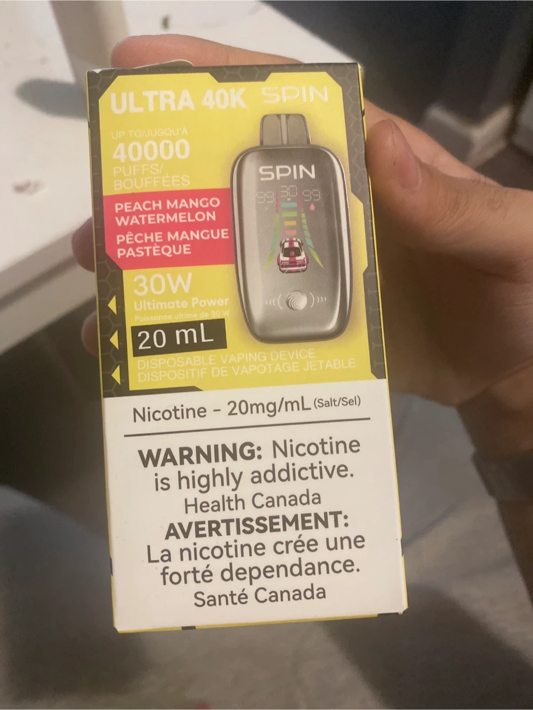 This is a Spin Ultra 40K disposable vaping device. It contains 20 mL of e-liquid with 20mg/mL nicotine. The flavour is Peach Mango Watermelon.