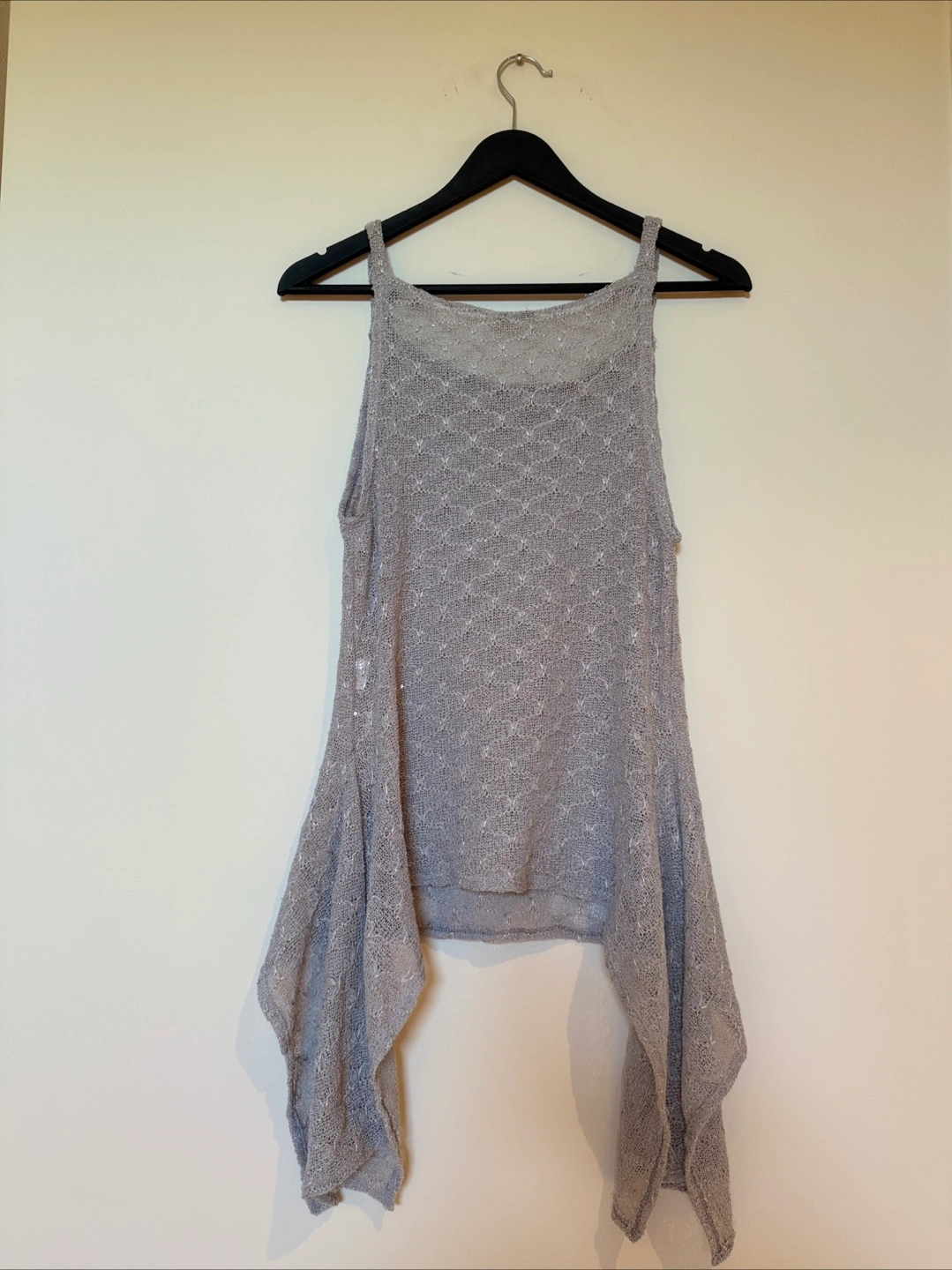 Selling a stylish flared top in size small! It's a lovely grey silver colour and in great condition. The top has an intricate mesh design. Perfect to elevate your night out!
