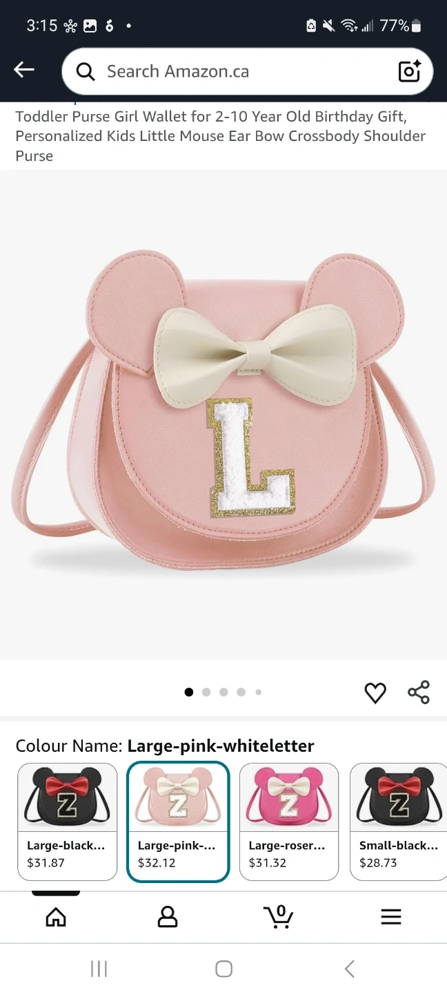 This cute pink toddler purse features a large chenille 'L' with gold glitter trim and a white bow. It's designed with mouse ears and has a faux leather finish. A small booklet with a unicorn design is also included. The purse's approximate width is 5 inches. Comes with a strap to make it a crossbody!
