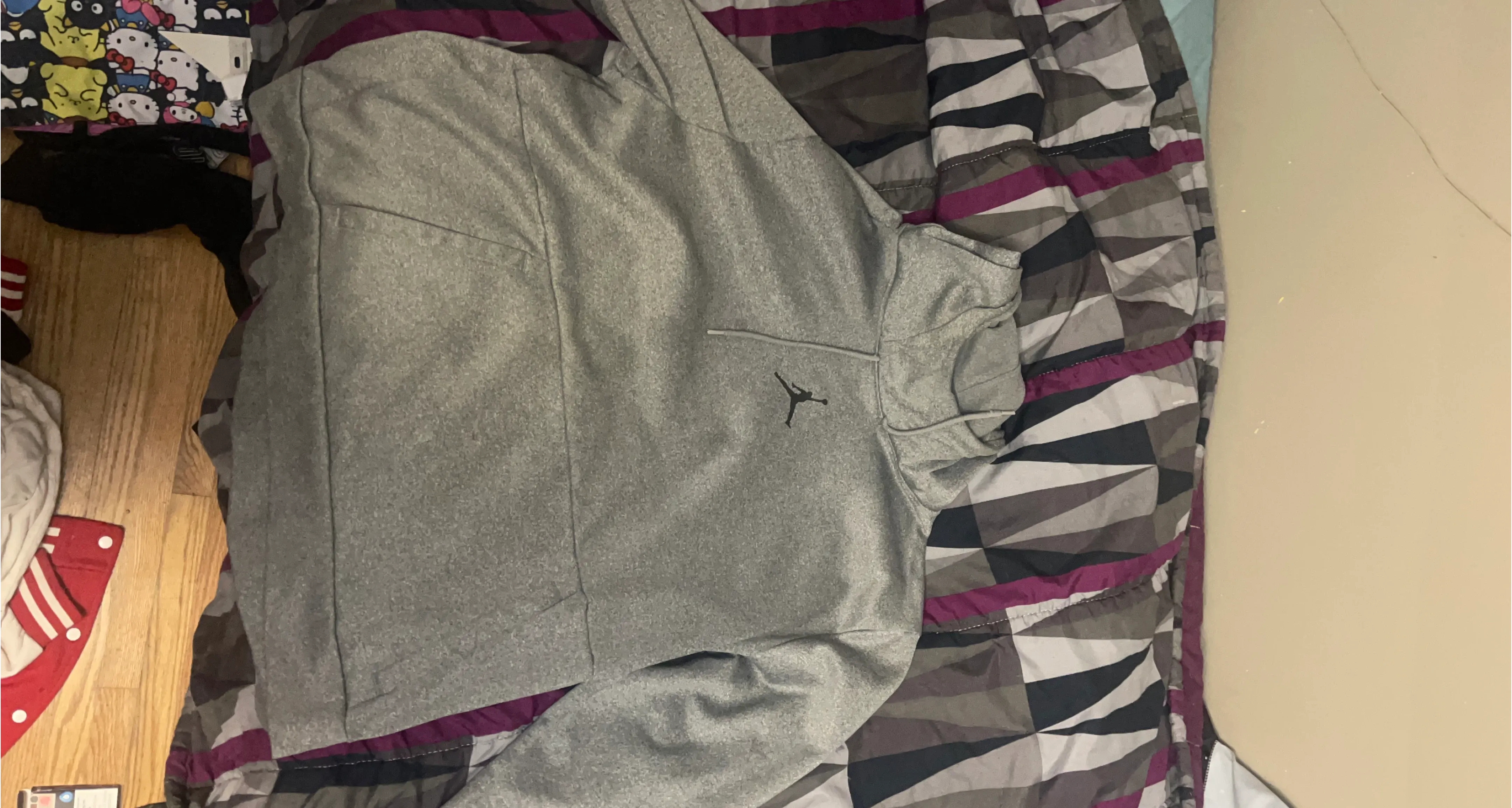 This is a grey Jordan pullover with a small Jumpman logo. It's made of a soft fleece material. Great for casual wear or athletic activities!