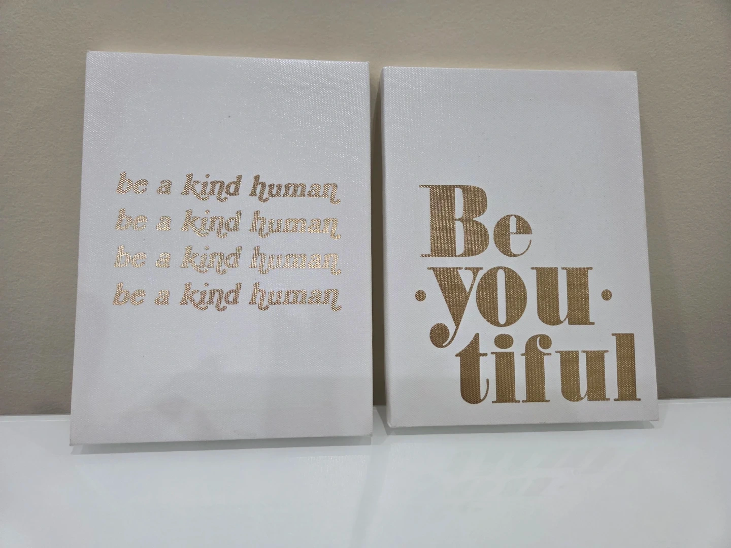 Two white canvas prints with gold lettering. One reads 'be a kind human' multiple times. The other says 'Be You-tiful!'. These pieces add a positive touch to any space.