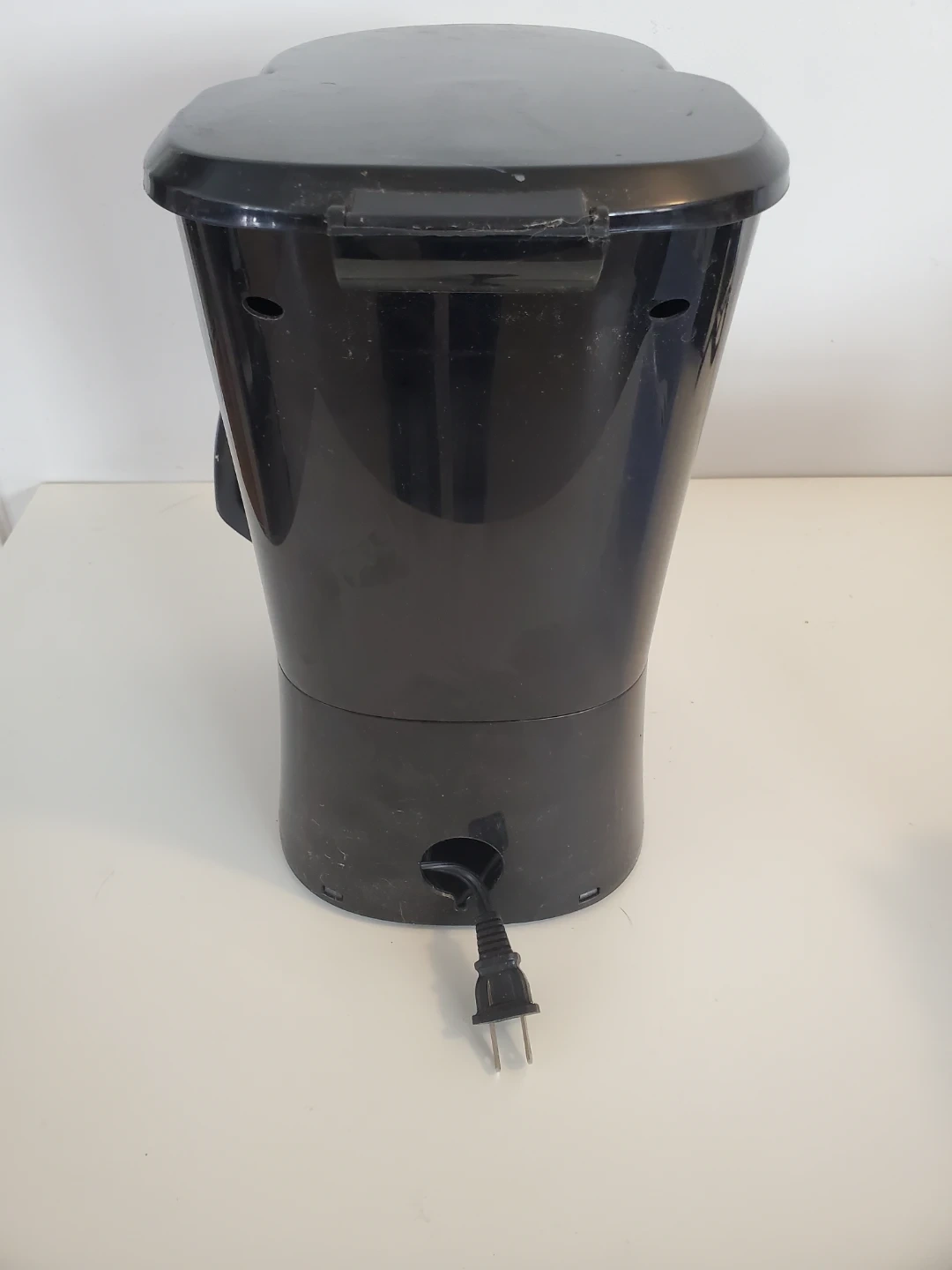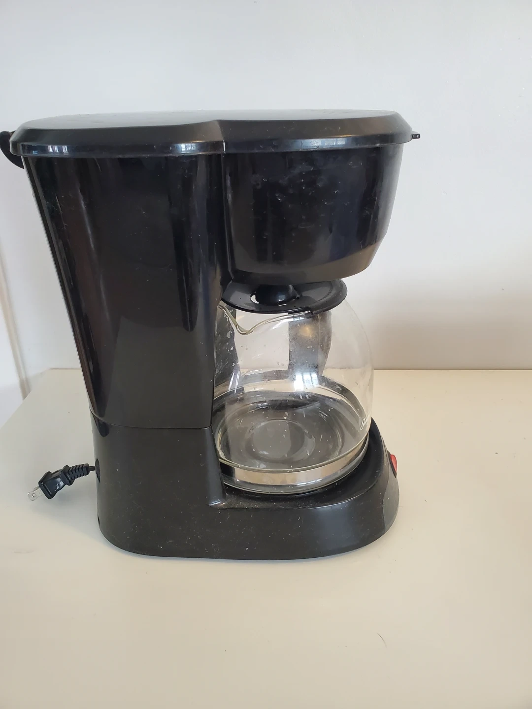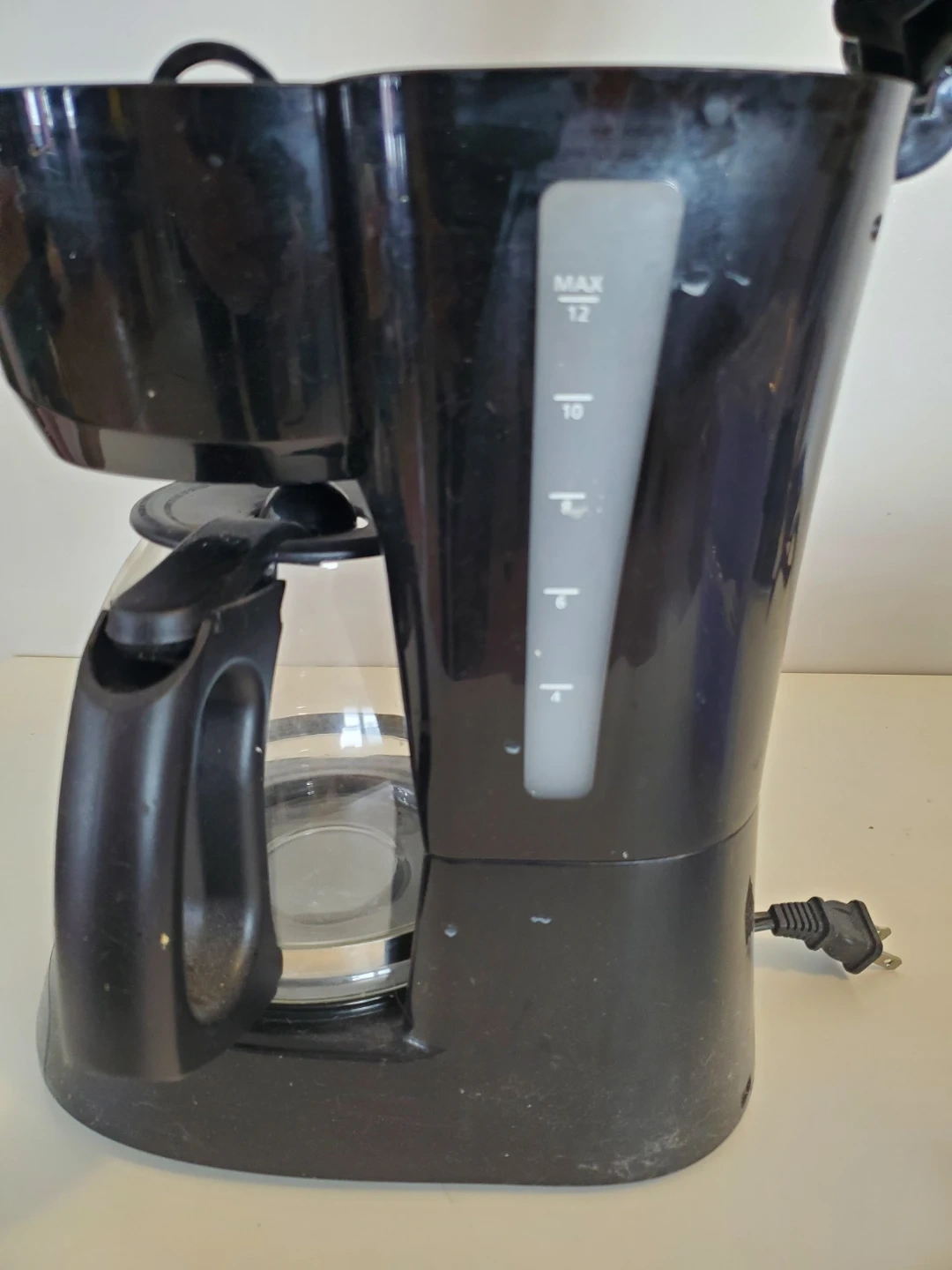 Black Sunbeam coffee maker with a 12-cup capacity. Includes a glass carafe and a reusable filter basket. It's ready to brew your morning coffee!