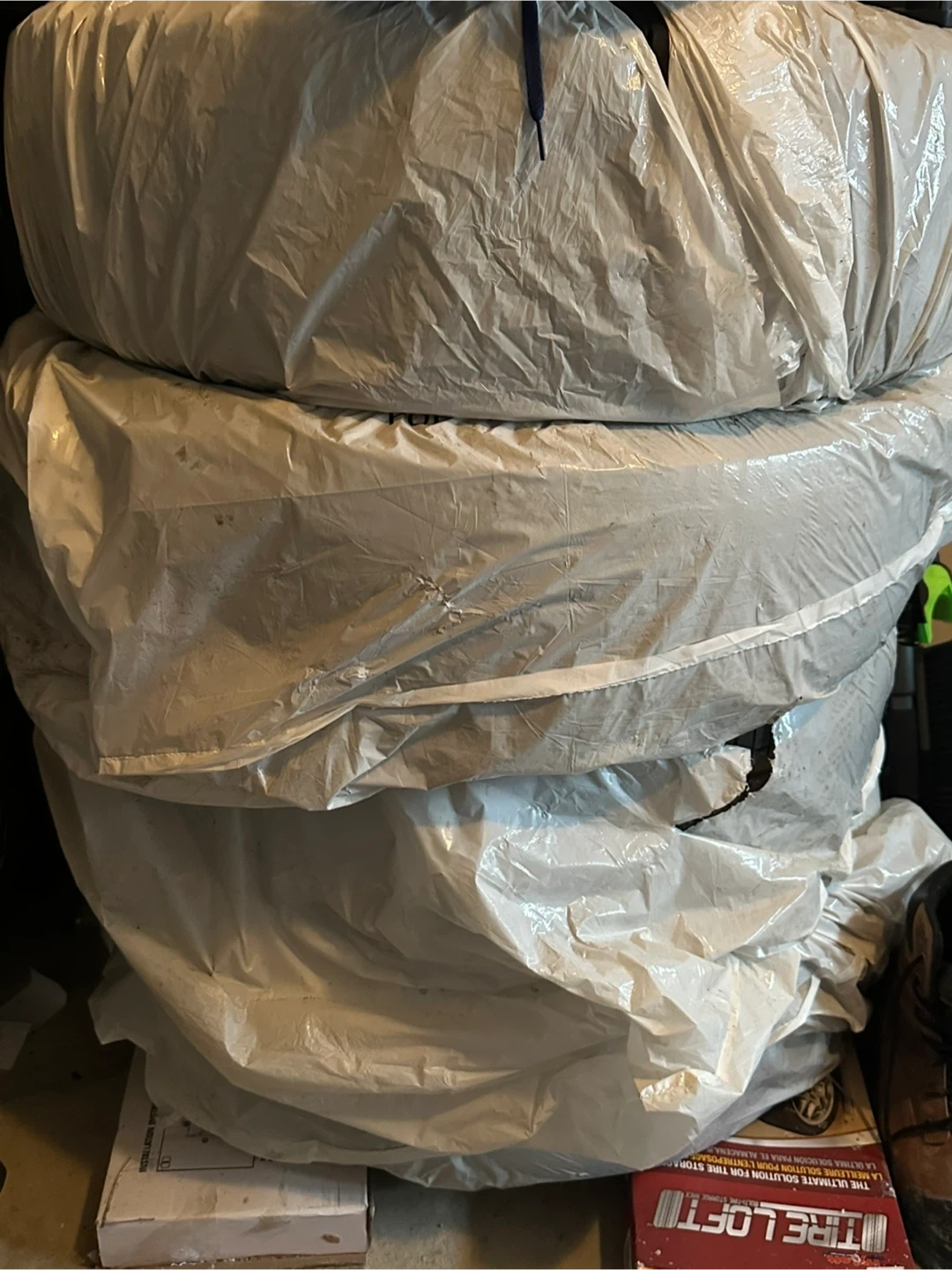 Even tread wear, no patches, no plugs, no sidewall damage.