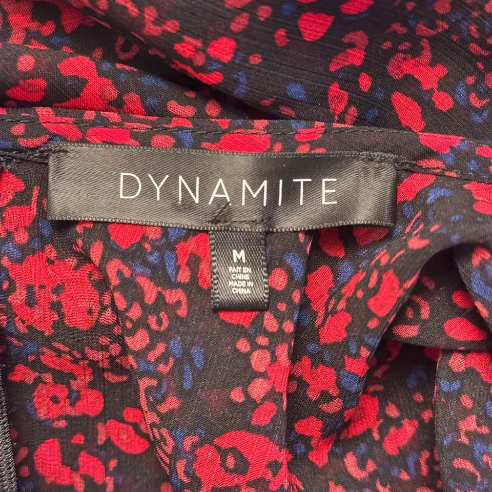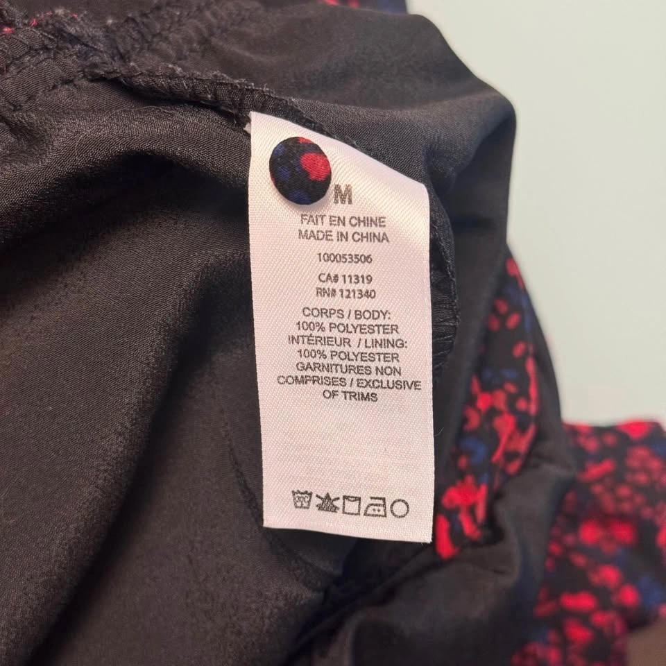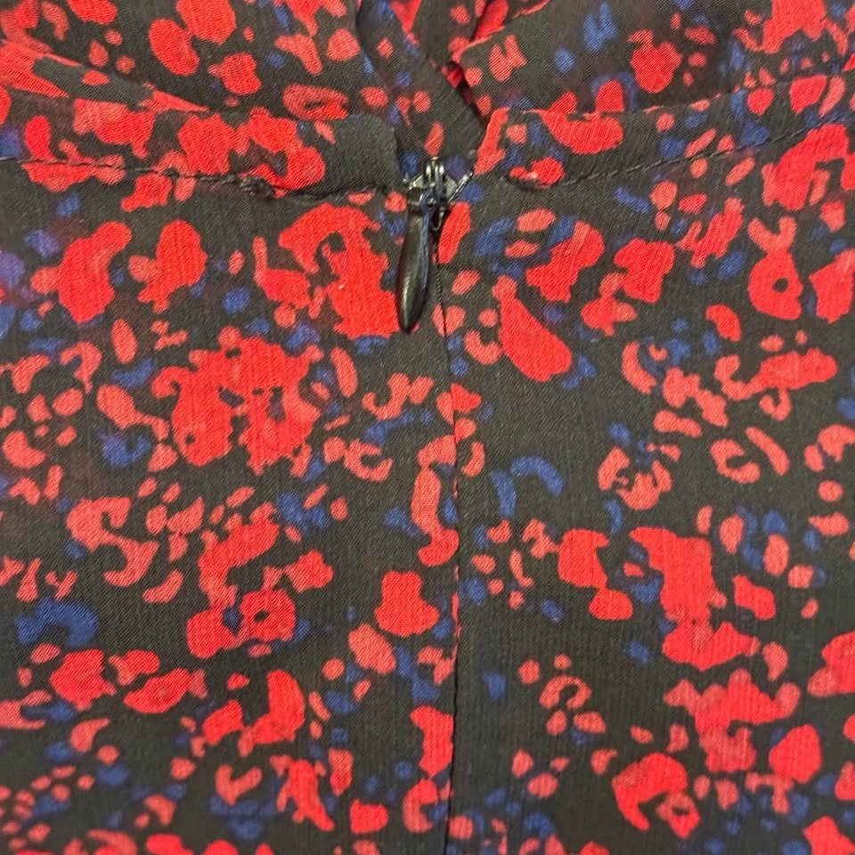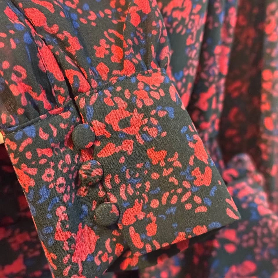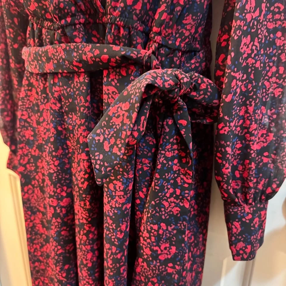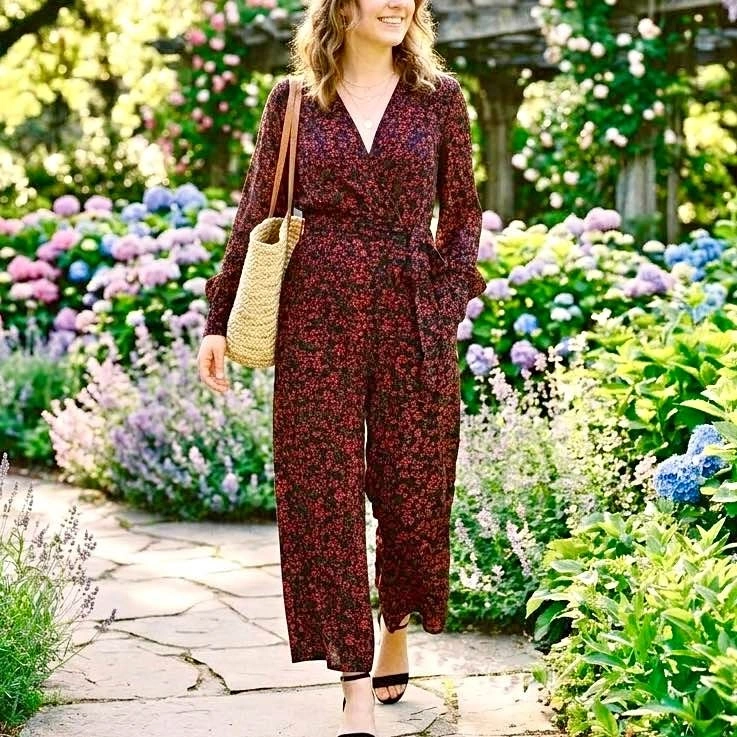 This versatile Dynamite floral jumpsuit features a stunning red, blue, and black ditsy print, perfect for wedding guests or a chic date night. The wide-leg silhouette creates a flowy, dress-like movement with the security of a jumpsuit. It has a flattering fit with a deep V-neck faux-wrap bodice and an adjustable self-tie waist belt to cinch your silhouette. Details include semi-sheer long sleeves with elegant triple-button cuffs and a discreet hidden back zipper. The fabric is lightweight 100% polyester and the body is fully lined for a smooth, opaque fit. Excellent pre-loved condition! Only the jumpsuit is for sale; bags, shoes, and accessories are not included.