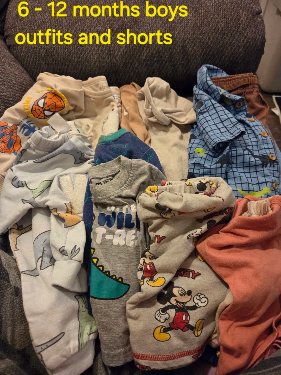 A collection of boys' outfits and shorts, sized for 6-12 months. Includes items with various prints like Spider-Man, dinosaurs, and Mickey Mouse. Assorted colours and styles.
