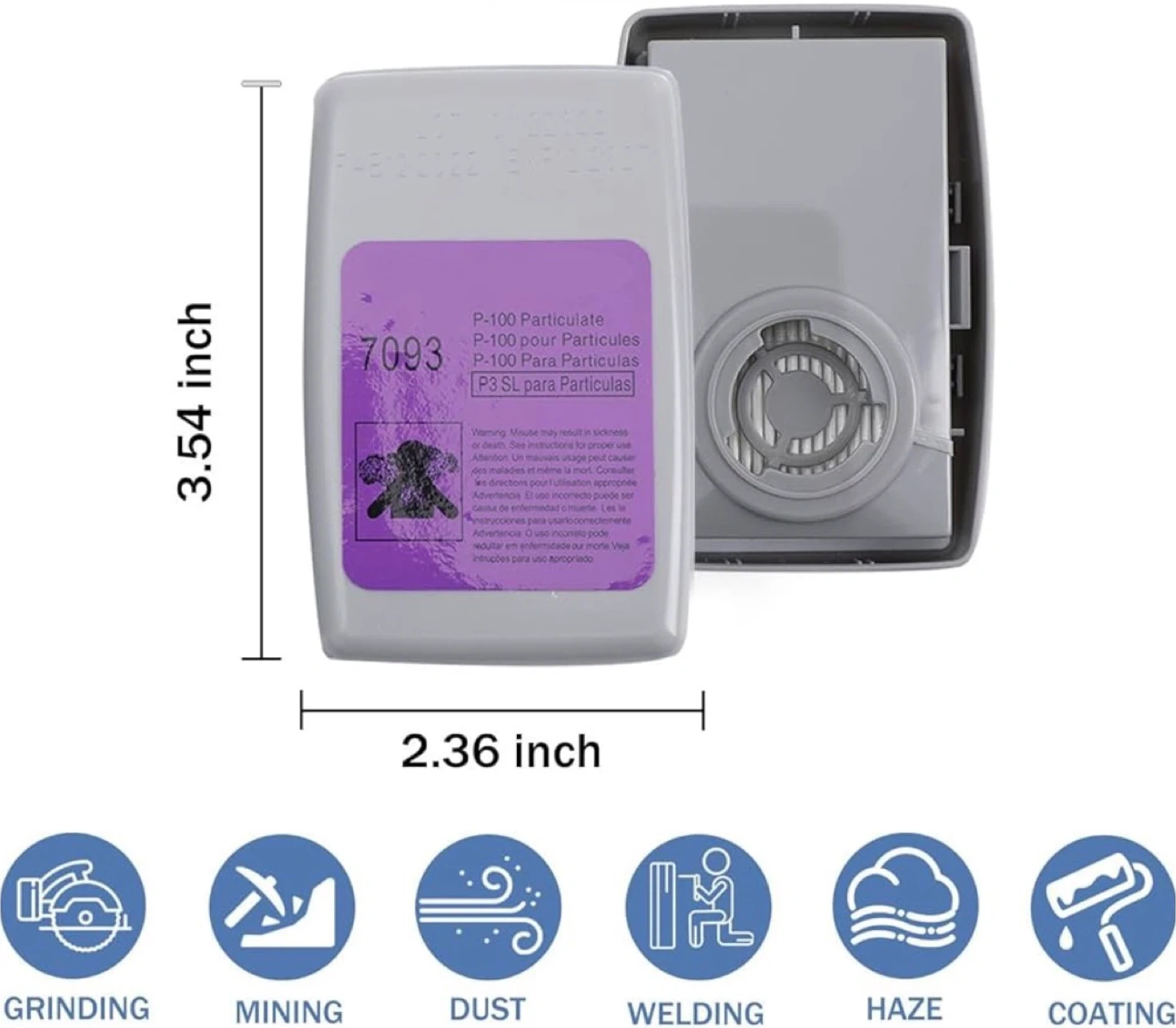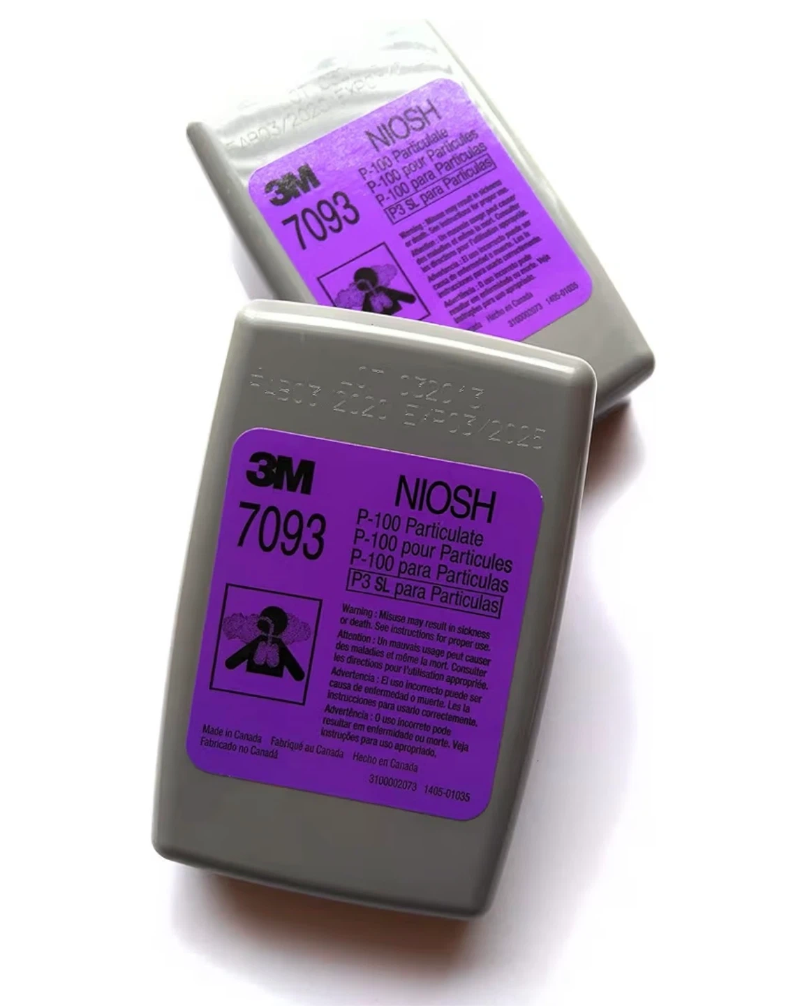 Genuine 3M 7093 filters for particulate protection. P100 rated for high-efficiency filtration. Filters are approximately 3.54 inches tall and 2.36 inches wide. These filters are designed for use in various applications like welding, grinding, and exposure to dust and chemicals.