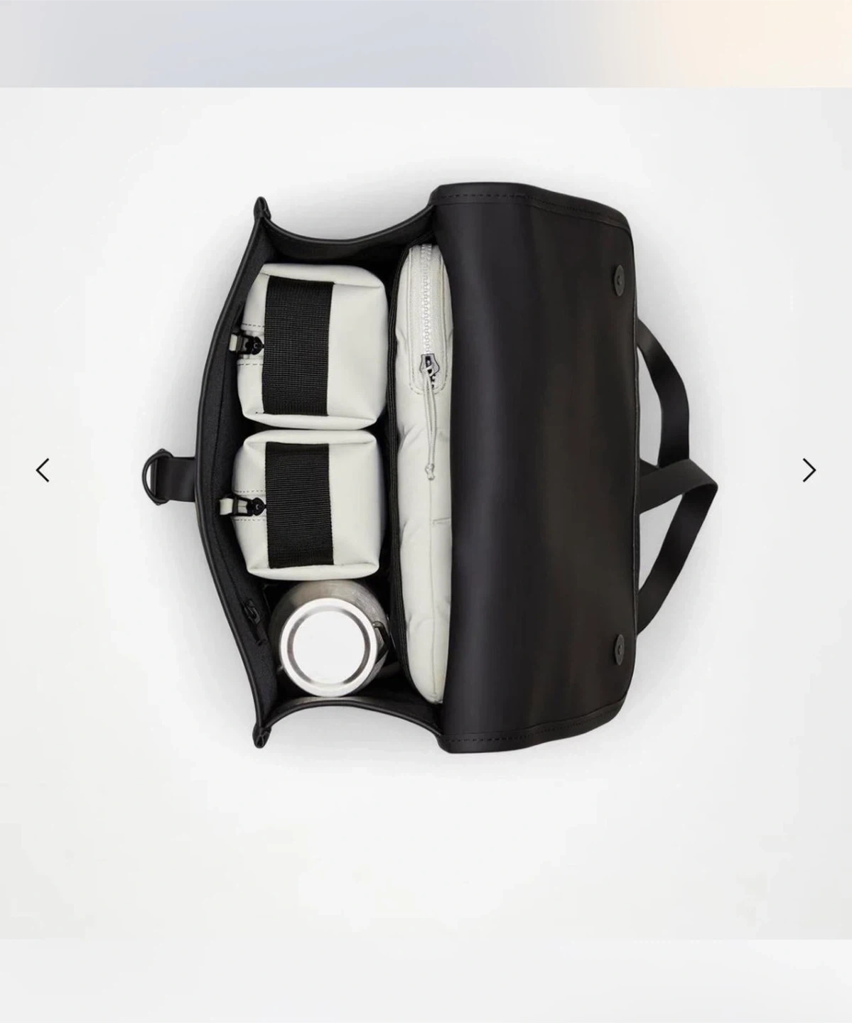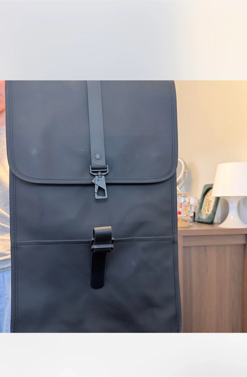 This is a black Rains backpack. It's made of waterproof material and has adjustable straps. Includes a laptop sleeve and internal pouches for organization.