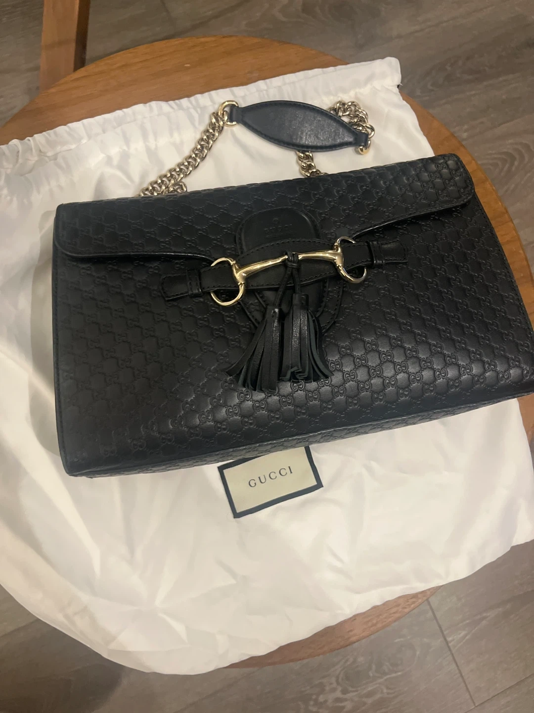 This is a black leather Gucci shoulder bag with gold hardware. It features the iconic GG monogram embossed all over the leather. The bag also has a tassel detail and a chain strap.