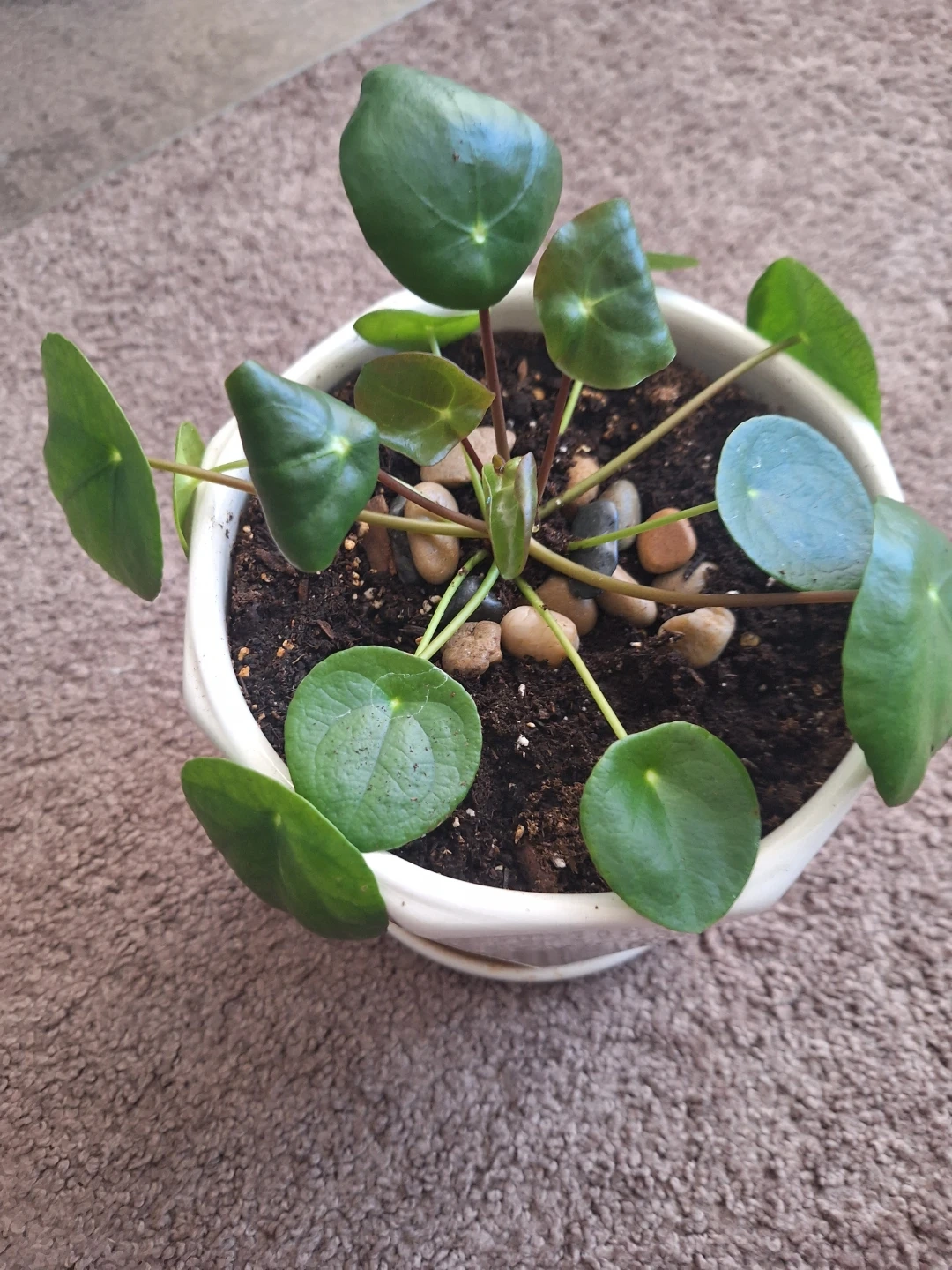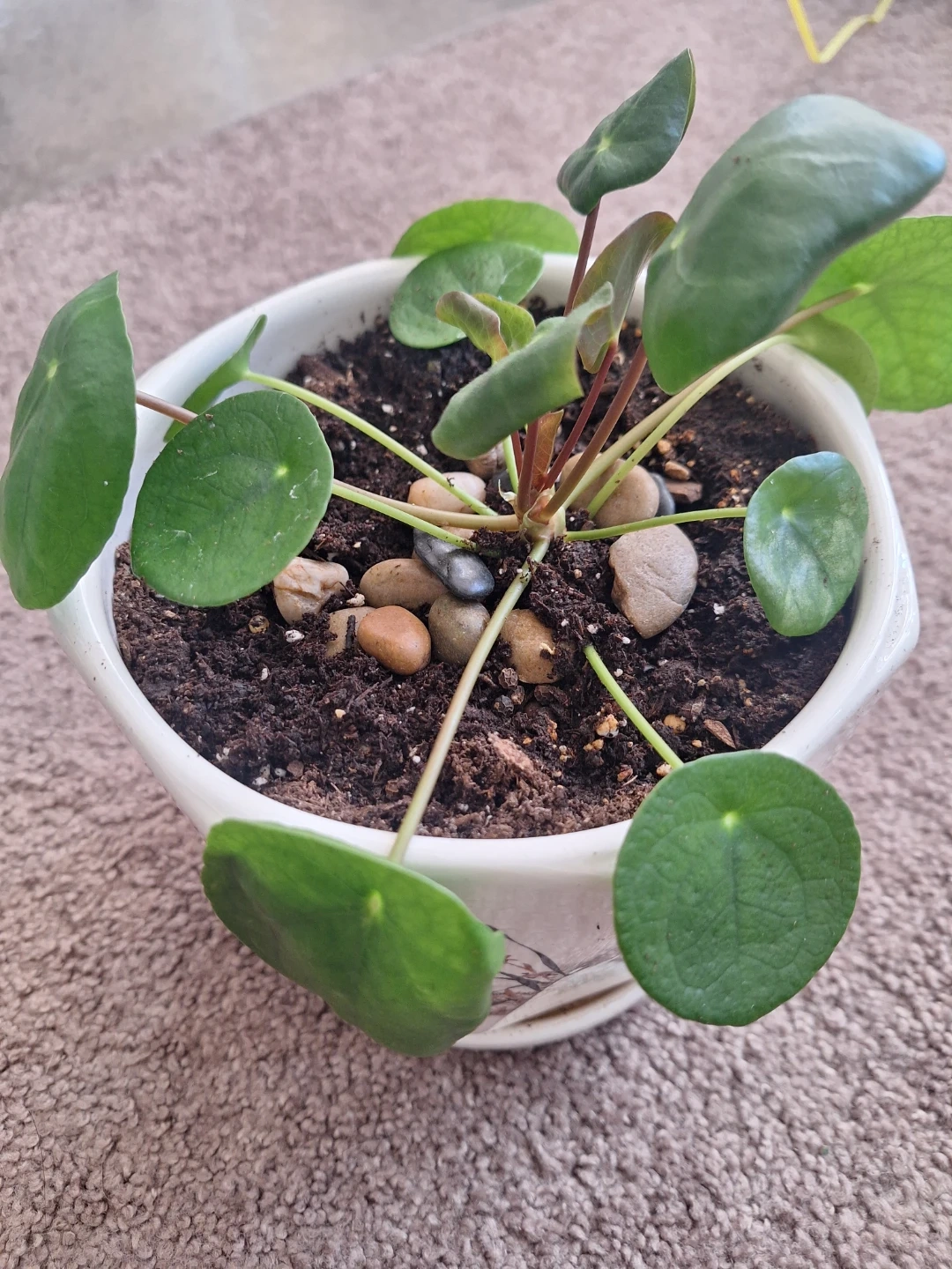 Pick up only. Healthy Pilea Peperomioides plant in a decorative white pot. Features round, coin-like leaves on vibrant stems. This plant is known for its easy care and unique appearance. It's a great addition to any indoor space! Easy to care. Around 8" tall.