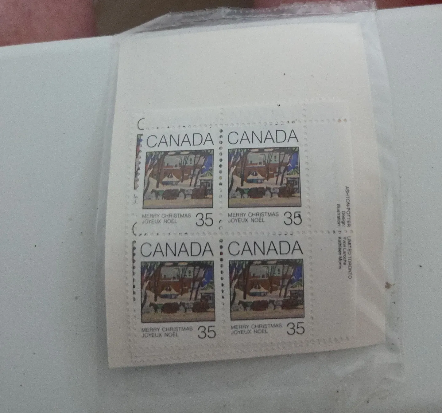 Four Canada stamps featuring a Merry Christmas and Joyeux Noel theme. Each stamp has a denomination of 35 cents. Illustrated by Kathleen Morris and designed by Yvon Laroche.