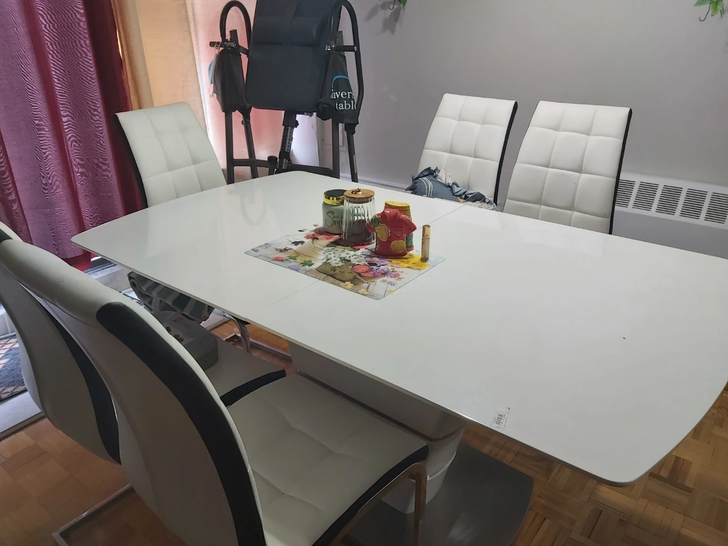 Modern white dining table with extendable leaf. Comes with four matching chairs featuring a contemporary design. Table has a sleek, easy-to-clean surface. Chairs have comfortable quilted upholstery.