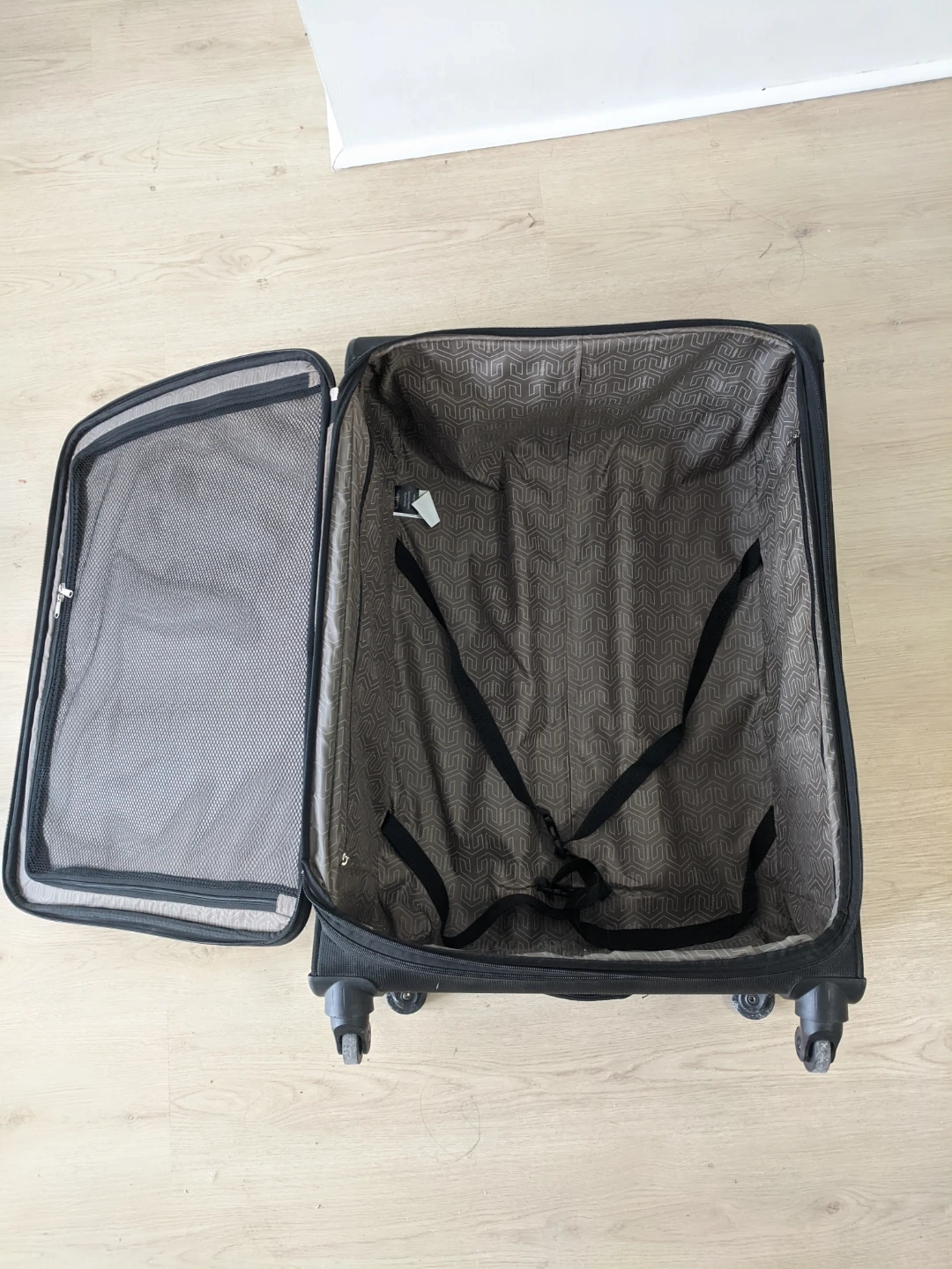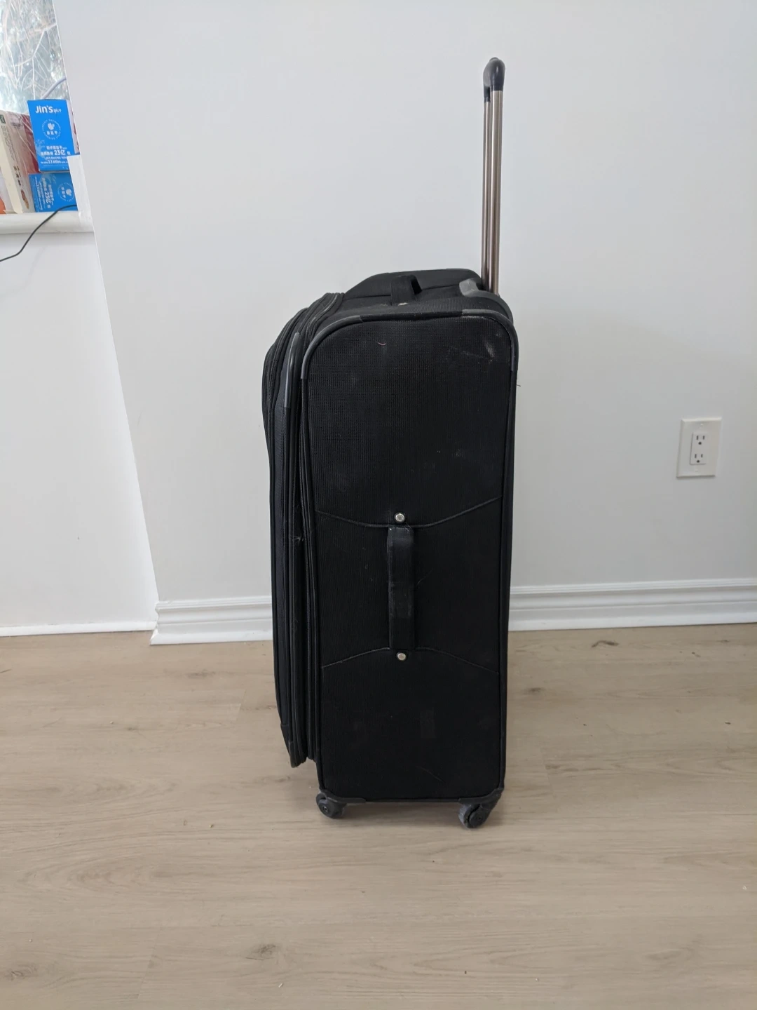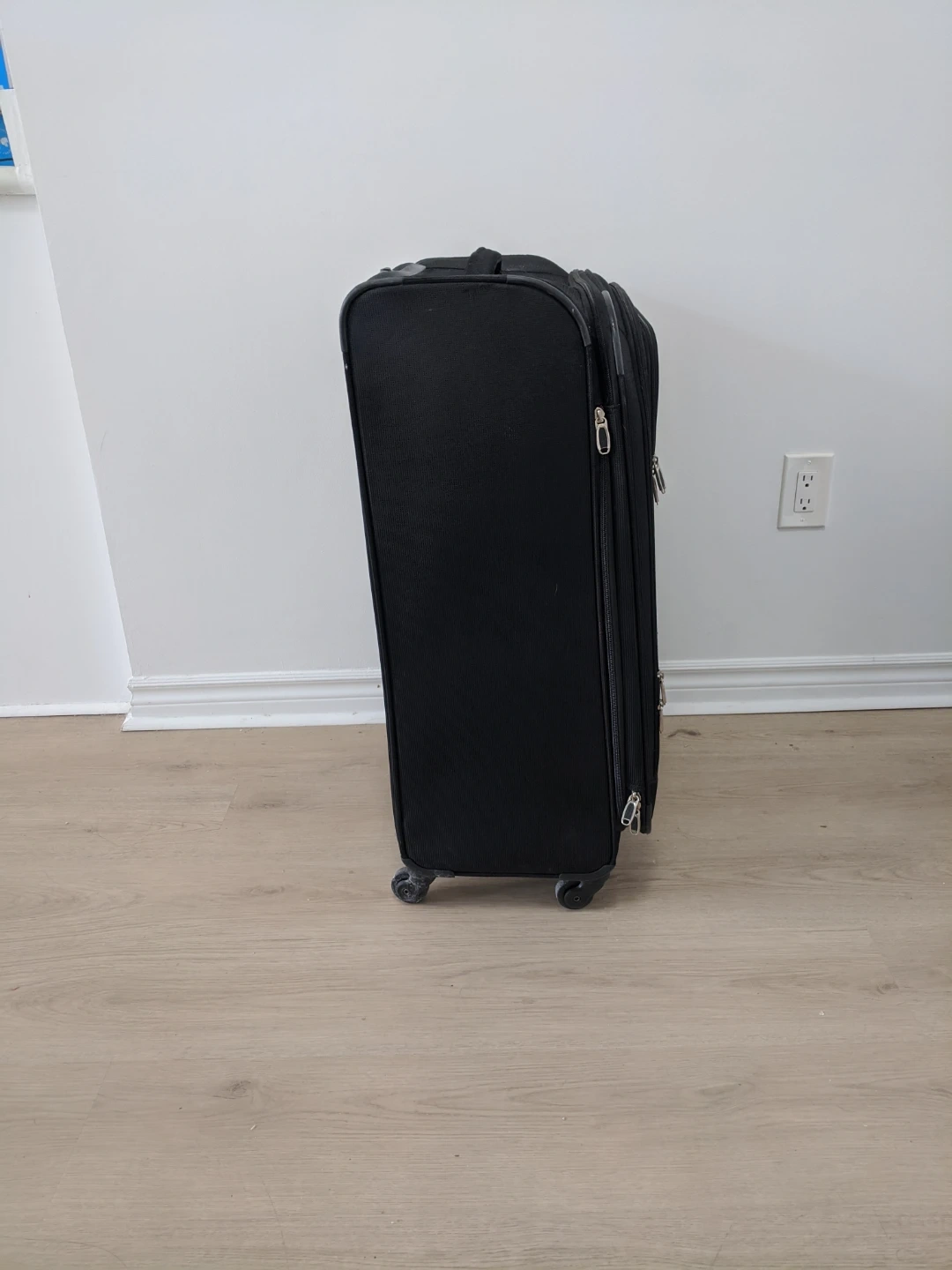 This is a black Travelpro softside spinner suitcase. It's made of durable fabric and has spinner wheels for easy manoeuvrability. It's a great size for weekend trips or Air luggage for longer journeys. Pick up at 195 Merton Street Toronto or pick up at Subway station Davisivill. And I can deliver it to your house but you need to pay me another $5. Thanks.